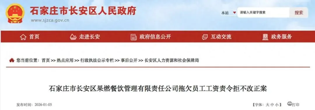 据石家庄市长安区人民政府官网2026年1月5日发布信息,因拖欠9名员工工资拒不改正,石家庄市长安区果燃餐饮管理有限责任公司被石家庄市长安区人力资源和社会保障局罚款1.9万元。