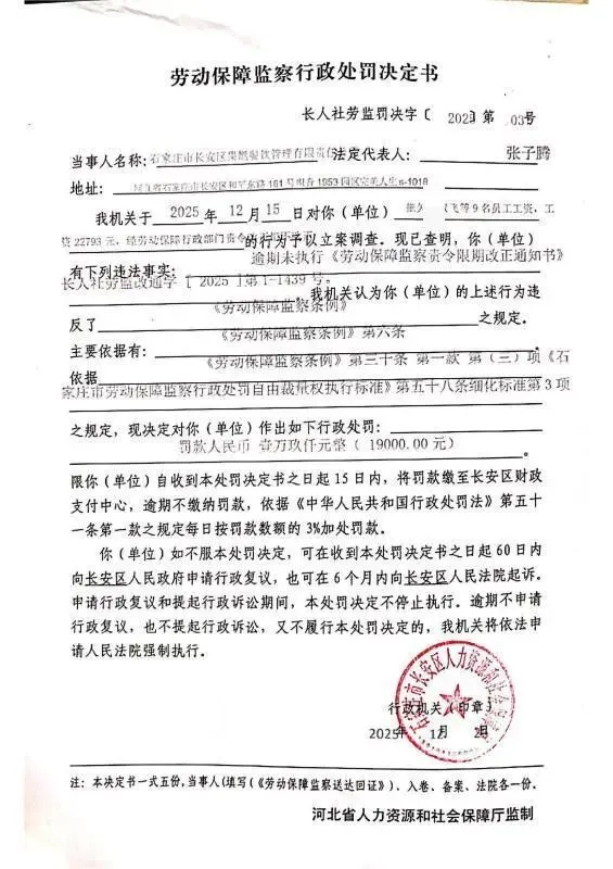 “长人社劳监罚决字[2025]第03号”行政处罚决定书显示,石家庄市长安区果燃餐饮管理有限责任公司拖欠刘某飞等9名员工工资,工资22793元,逾期未执行《劳动保障监察责令限期改正通知书》,违反了《劳动保障监察条例》第六条:“用人单位应当遵守劳动保障法律、法规和规章,接受并配合劳动保障监察。”的规定。