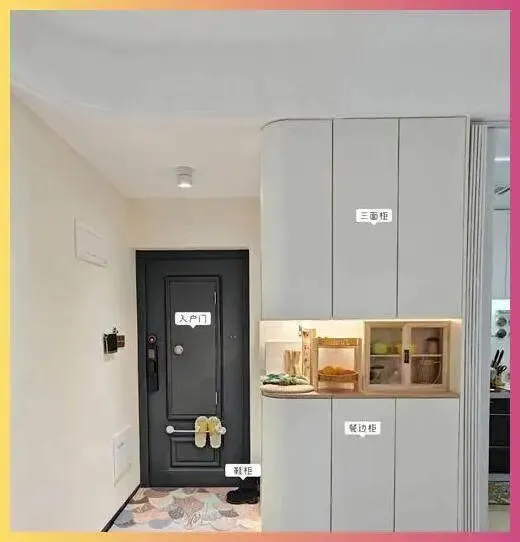 柜下留空20公分,用来暂时放快递包裹和买菜袋,一进门手都不用空着翻柜子。更懂生活的是,她还在墙上加了个**“便签磁板”**,每天出门看一眼:今天垃圾要分类、明天娃有英语课……小细节却让生活变得特别有序。