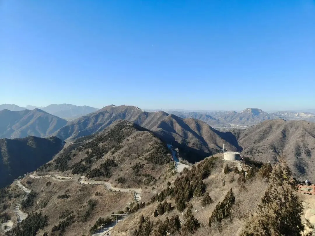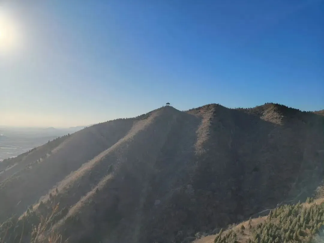 站在观景台极目远眺,连绵的山峦如褐色的波浪向天边展,层叠的峰谷间,冬日的萧瑟与苍茫尽收眼底。阳光洒在山脊上,为枯黄的草木镀上金边,远处的平原与天际线交融,构成一幅壮阔的自然画卷。此刻,城市的喧嚣被山风涤荡干净,只剩天地间的宁静与内心的豁达。