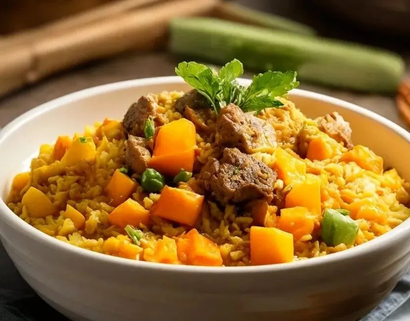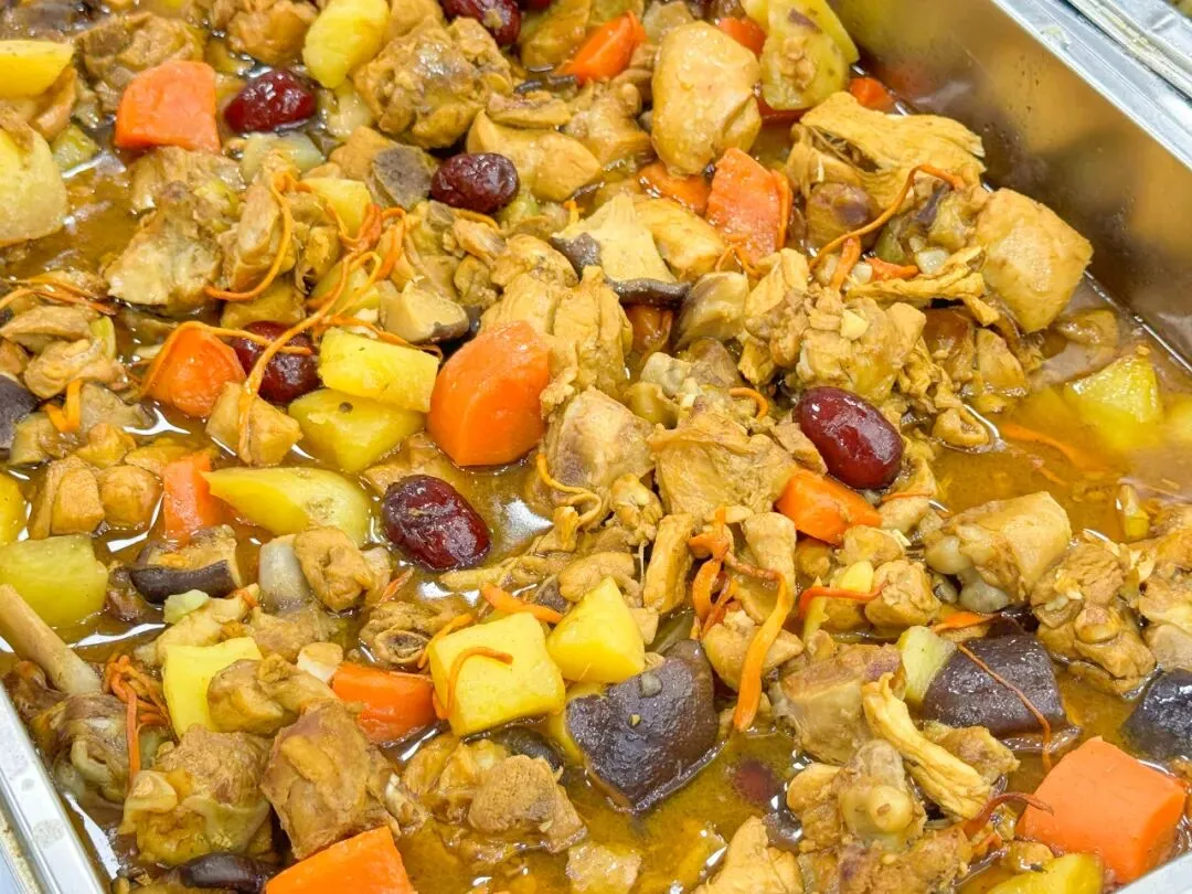 菜品:黄焖鸡块(宽粉5克,豆泡5克,土豆120克,鸡块100克)、甘蓝豆腐炒粉条(甘蓝80克,豆腐50克,粉条40克)