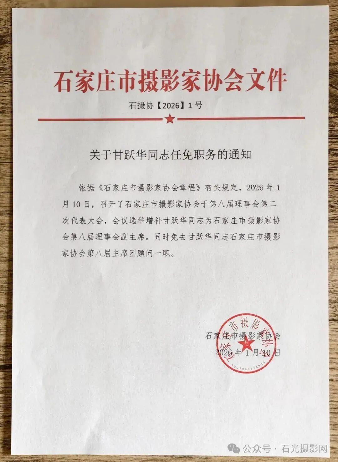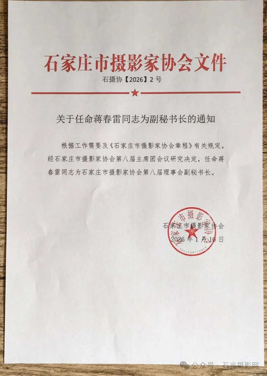 为进一步加强石家庄市摄影家协会主席团建设,提升协会服务能力与行业影响力,更好地团结引领全市广大摄影工作者投身文艺创作实践,根据工作需要及《石家庄市摄影家协会章程》有关规定,经石家庄市摄影家协会第八届理事会主席团会议研究并报请石家庄市文联批准,在石家庄市摄影家协会第八届理事会第二次代表大会上,理事代表通过举手表决,选举增补甘跃华同志为石家庄市摄影家协会第八届理事会副主席。会上还宣布了任命蒋春雷同志为石家庄市摄影家协会第八届理事会副秘书长的决定。