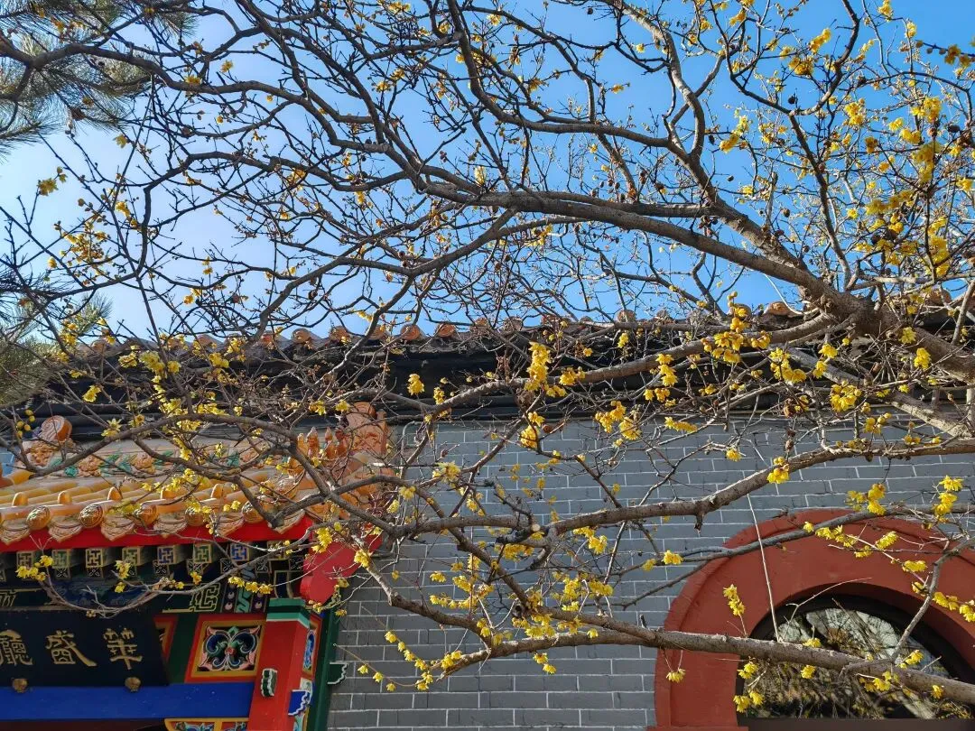 凑近一看,金黄色的小花开得可密,样子有点像迎春花,但香味更沉、更静。树边上围了好多人,都举着手机拍。我也凑了个热闹,听说这棵树是乾隆年间种下的,三百多岁了,这可真是棵“老神仙树”呀!
