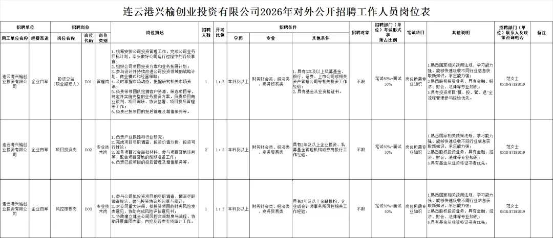 详见附件《连云港兴榆创业投资有限公司2026年对外公开招聘工作人员岗位表》(附件1,以下简称《岗位表》)。《岗位表》可在赣榆区人民政府网(http://www.ganyu.gov.cn)政务公开栏查询、下载。