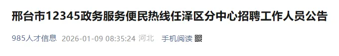 2026年1月8日-2026年1月10日,邢台市12345政务服务便民热线任泽区分中心通过 “985人才信息”微信公众号发布,公告在“985人才信息”微信公众号公布招聘人数、条件以及报名考试有关信息。