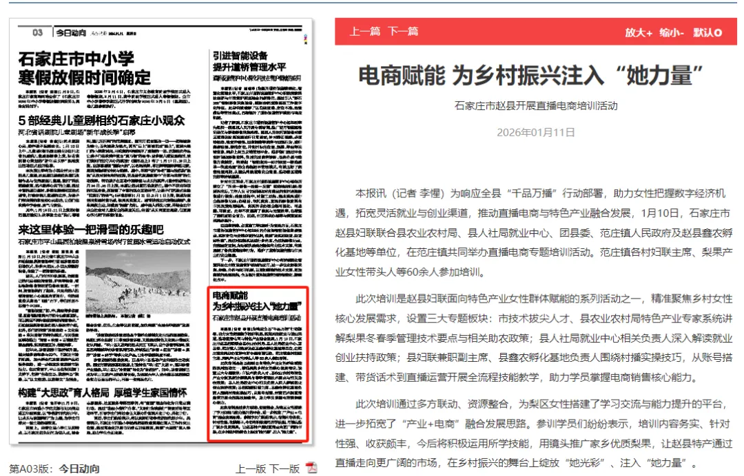 本报讯(记者 李惺)为响应全县“千品万播”行动部署,助力女性把握数字经济机遇,拓宽灵活就业与创业渠道,推动直播电商与特色产业融合发展,1月10日,石家庄市赵县妇联联合县农业农村局、县人社局就业中心、团县委、范庄镇人民政府及赵县鑫农孵化基地等单位,在范庄镇共同举办直播电商专题培训活动。范庄镇各村妇联主席、梨果产业女性带头人等60余人参加培训。