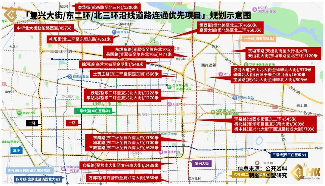2025年的石家庄交通路网有五项「大工程」,分别是仓丰路与汇明路贯通、谈固南大街南延、和平东路高架改造以及复兴大街、东二环和北三环沿线道路连通。其中覆盖面最大,影响也最深的就是复兴大街、东二环和北三环沿线道路连通,因为包含的新建道路有23条,涉及「城四区」中的三个。