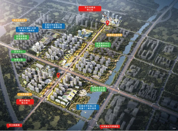 商业方面,中国奥莱集团已经官宣,与东西庄开发商——河北正华达成战略合作,合作开发长安TOD花海十二城商业综合体,并将其作为未来十年全国十大Outlet+(奥莱+)超级综合体之一。东西庄板块的全面铺开,既是石家庄城市格局之变的样板,也是新中轴伸展骨架的驱动力。