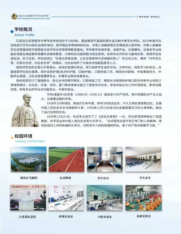 石家庄白求恩医学中等专业学校(简称石家庄白求恩医专,石家庄白求恩医学院)是河北省重点院校“以白求恩精神育人,培养白求恩传人”为立校之本,专业培养医护人才,开设3+3高级护理,临床医学,口腔医学升学班。详细咨询招办赵老师:0311-85064530、18032031895(微信)