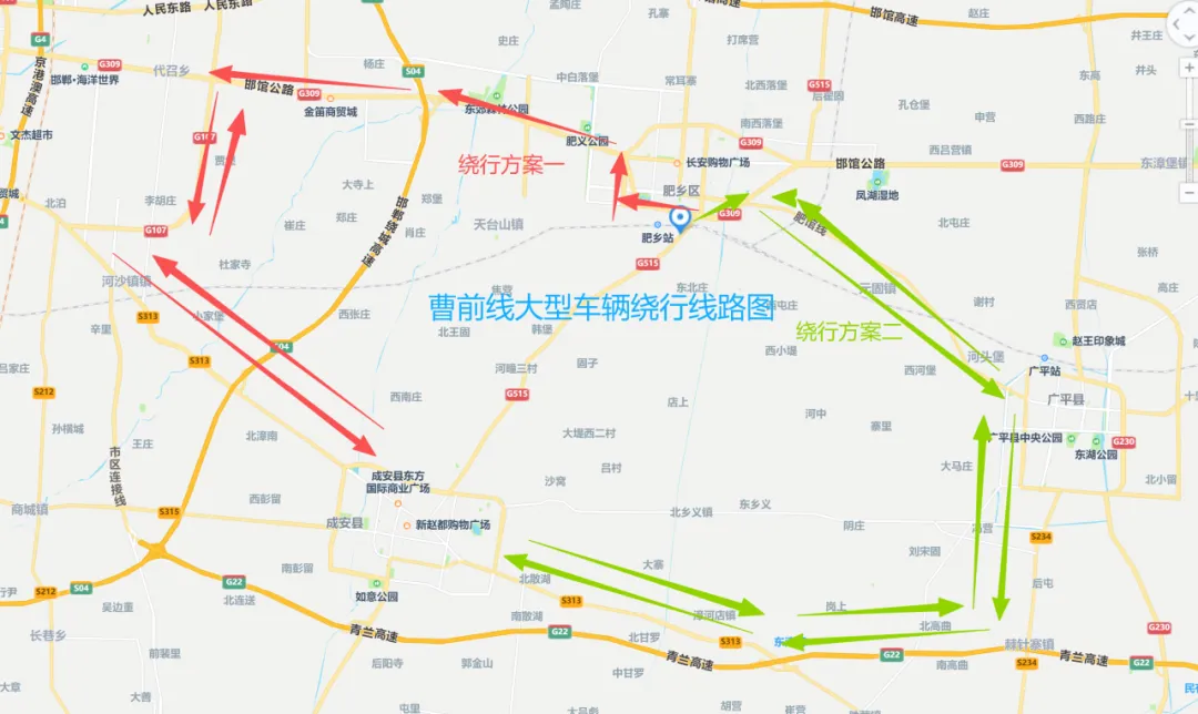 线路2:请沿G309国道向东行驶,转肥馆线至广平县,转S234至S313至成安县。