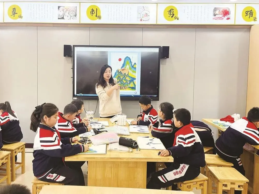 互动教学环节成为活动的核心亮点。省美协会员、市优秀少儿美术教师李会老师以北宋少年画家王希孟的传世名作《千里江山图》为教学范本,带领孩子们领略青山绿水的雄浑壮阔与笔墨精妙。面对孩子们天马行空的艺术想象和略显稚嫩的笔触,李老师始终饱含耐心与温情,从构图的疏密布局、配色的冷暖调和到笔墨的轻重运用,逐一进行手把手指导,细致解答孩子们提出的每一个疑问。郭楚宁老师则穿梭在学生中间,针对不同孩子的创作特点进行个性化点评,用鼓励的话语激发孩子们的创作自信。在老师们的悉心引导下,孩子们大胆挥毫、自由创作,将童真童趣融入笔墨色彩之中,一幅幅充满想象力、色彩斑斓的画作跃然纸上,原本安静的美术教室变成了一片洋溢着创造力的欢乐艺术海洋。
