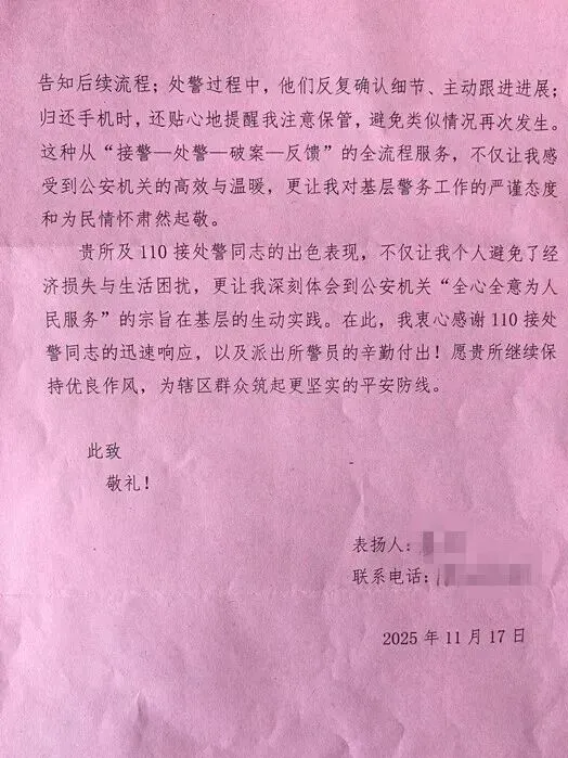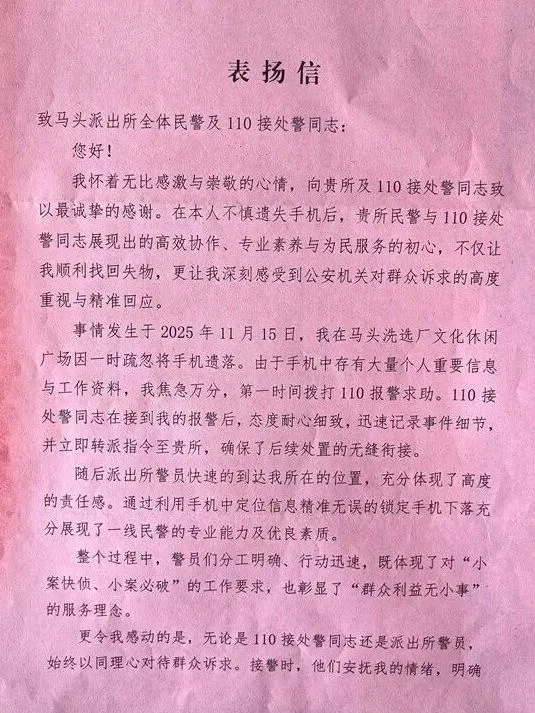 “警察同志,我的手机丢了,请你们一定要帮帮我!”2025年11月15日14时许,马头派出所接到群众温某焦急的报警求助,自己的手机在洗选厂家属院广场办事时不慎丢失了,手机内有大量重要资料及个人信息,希望民警同志们一定帮其找回来。民警迅速带队赶到现场为群众开展寻“机”工作,民警详细询问遗失时间、地点,通过排查、分析、研判,经不懈努力,最终为失主找回了丢失的手机,并将其完好无损地归还给了失主,受到失主温某的高度赞扬。