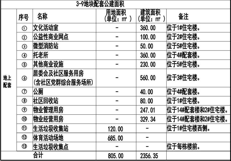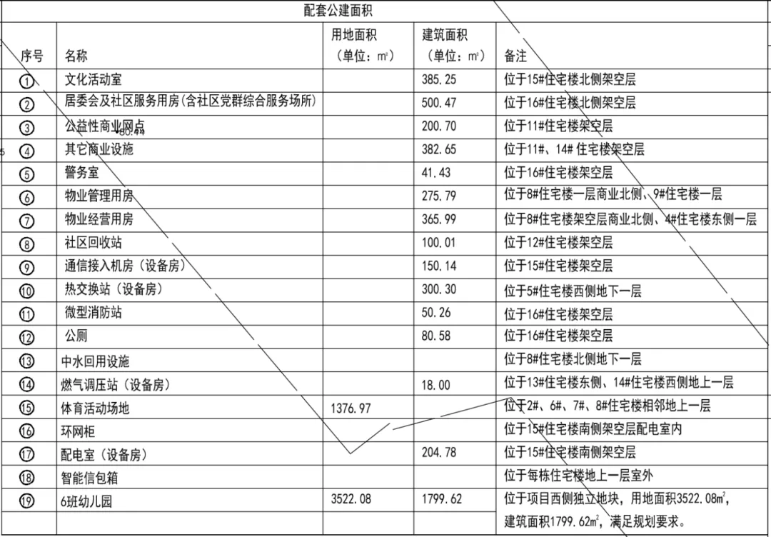 配套公建包括文化活室、公益性商业网点、托老所、体育活动场地、物业经营用房、微型消防站、生活垃圾收集点等。