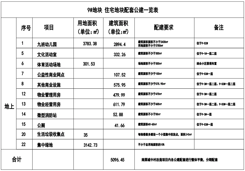 配套公建包括九班幼儿园、文化活动室、体育活动场地、公益性商业网点、微型消防站、公厕等。