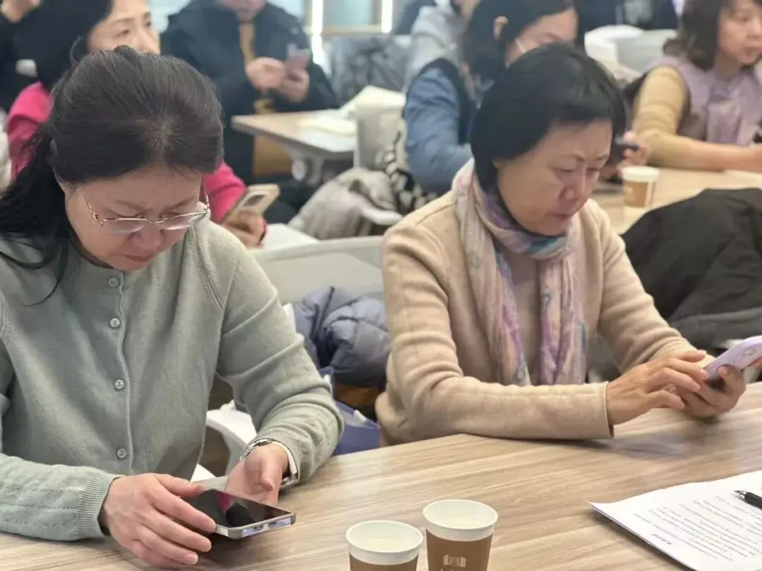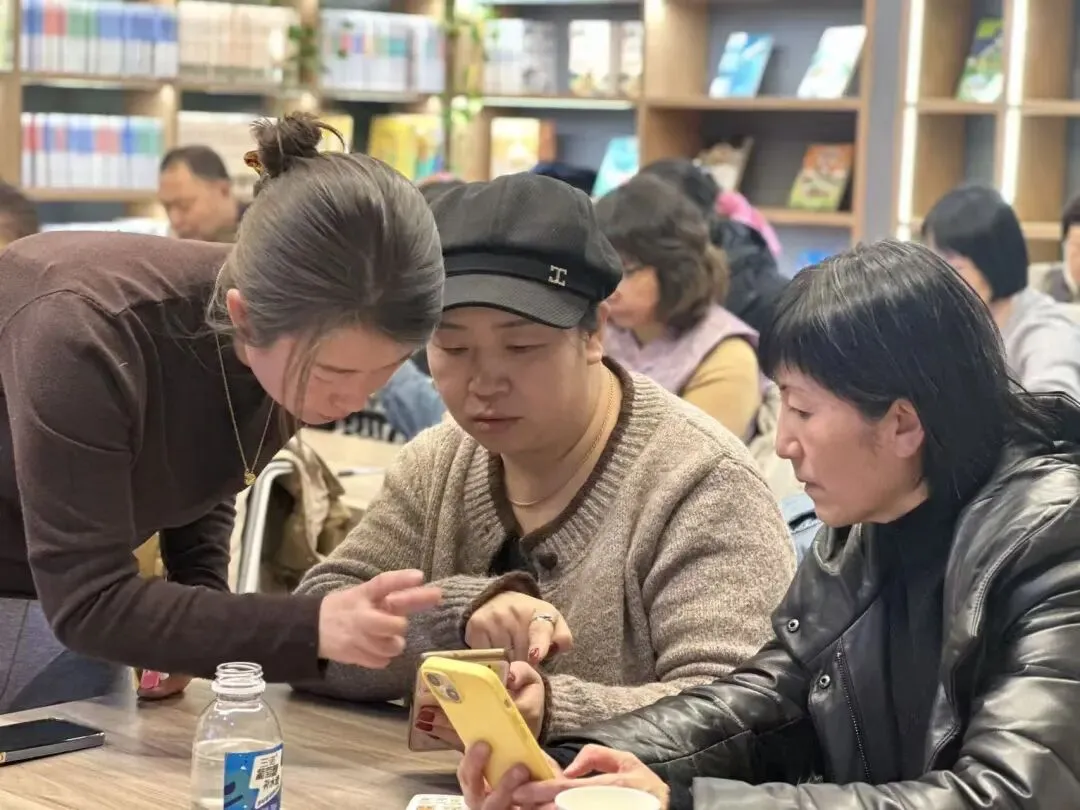 课堂现场,学员们不仅热情高涨,认真聆听记录,还根据老师讲解的内容纷纷拿出手机,对照老师讲的技巧现场实操,从调整角度到设置参数,每一个细节都认真琢磨。遇到不懂的问题,大家互相交流探讨,老师也耐心地逐一指导,书店里洋溢着浓厚的学习氛围。