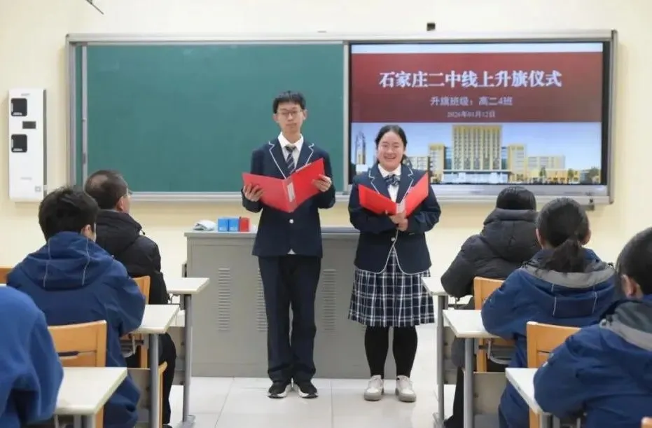 晨光熹微,红旗招展。1月12日清晨,石家庄二中全体师生云端相聚,隆重举行线上升旗仪式。高二4班担任国旗班(班主任赵亚轩),郭雪娇、刘宇航同学主持。