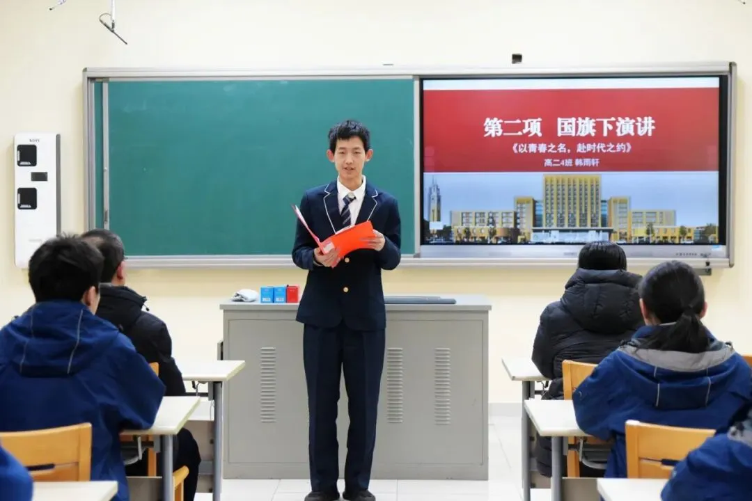 高二4班韩雨轩同学以《以青春之名,赴时代之约》为题作国旗下演讲。他从“十四五”收官与“十五五”启航的时代背景出发,深情回顾了近年来中国青年在航天、体育、乡村振兴、生态保护等各领域的奋斗身姿,号召全体同学以优秀青年为榜样,将个人成长融入国家发展进程。