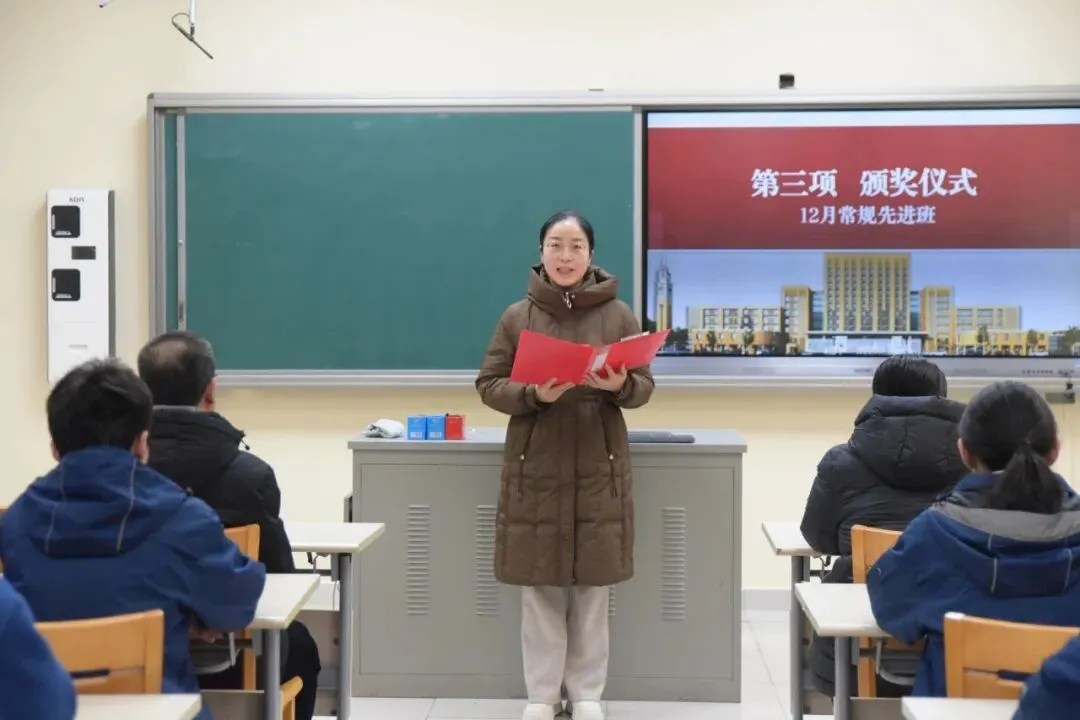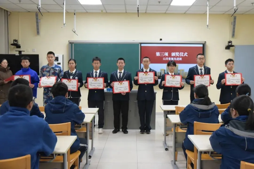 升旗仪式结束后,学校举行了12月常规先进班集体表彰仪式。团委书记武丽华宣读获奖班级名单,校领导为获奖班级颁发荣誉证书,对各班在常规管理、班风建设、学风营造等方面取得的突出成绩予以高度肯定。
