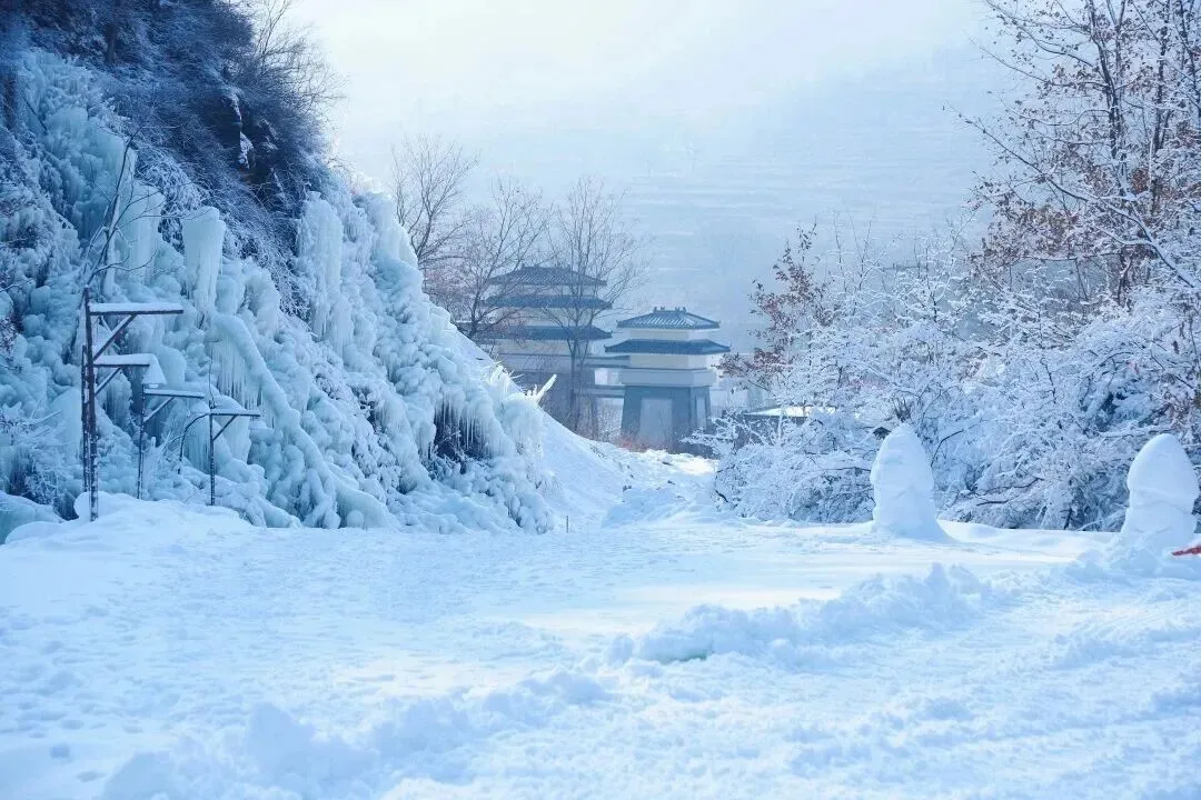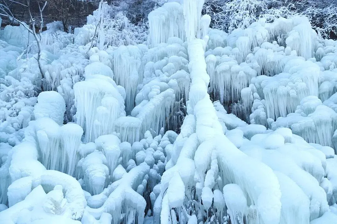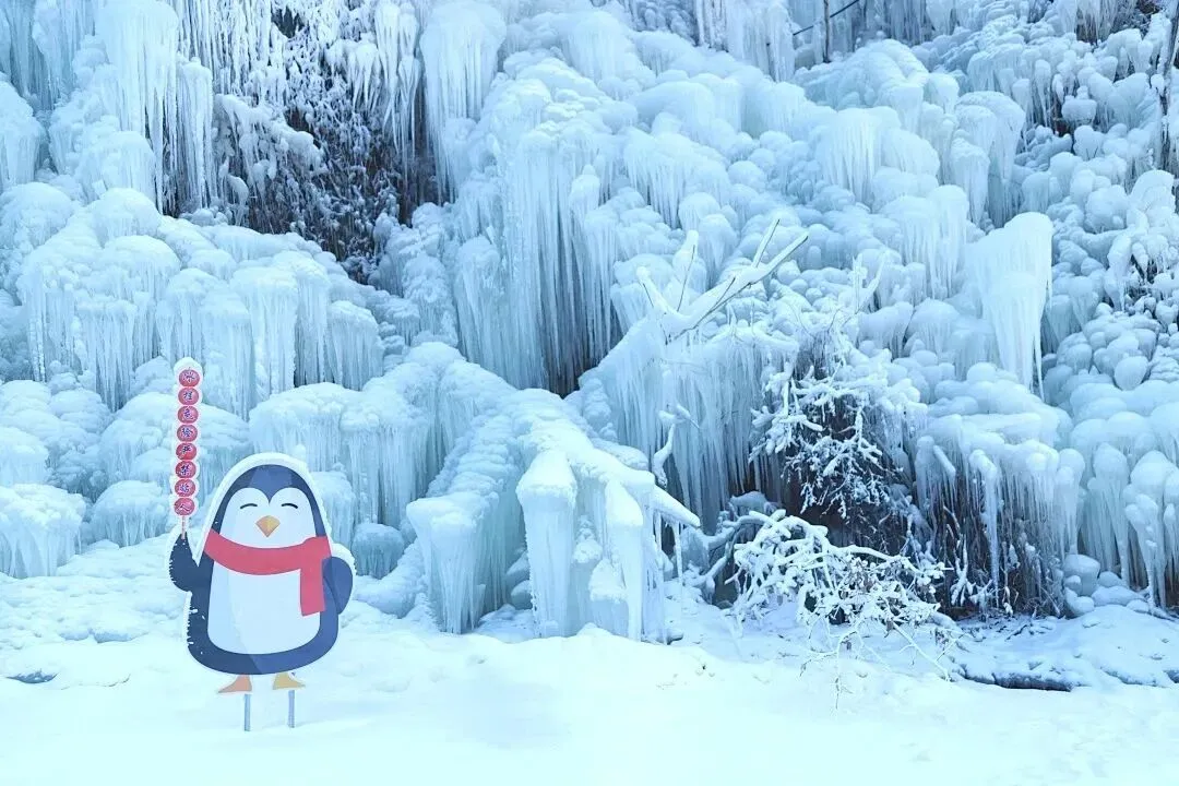 走进古武当山雪乡,首先映入眼帘的便是那壮观的冰川瀑布。巨大的冰瀑从山崖上倾泻而下,层层叠叠,晶莹剔透,仿佛是大自然用冰雪精心雕琢的艺术品。