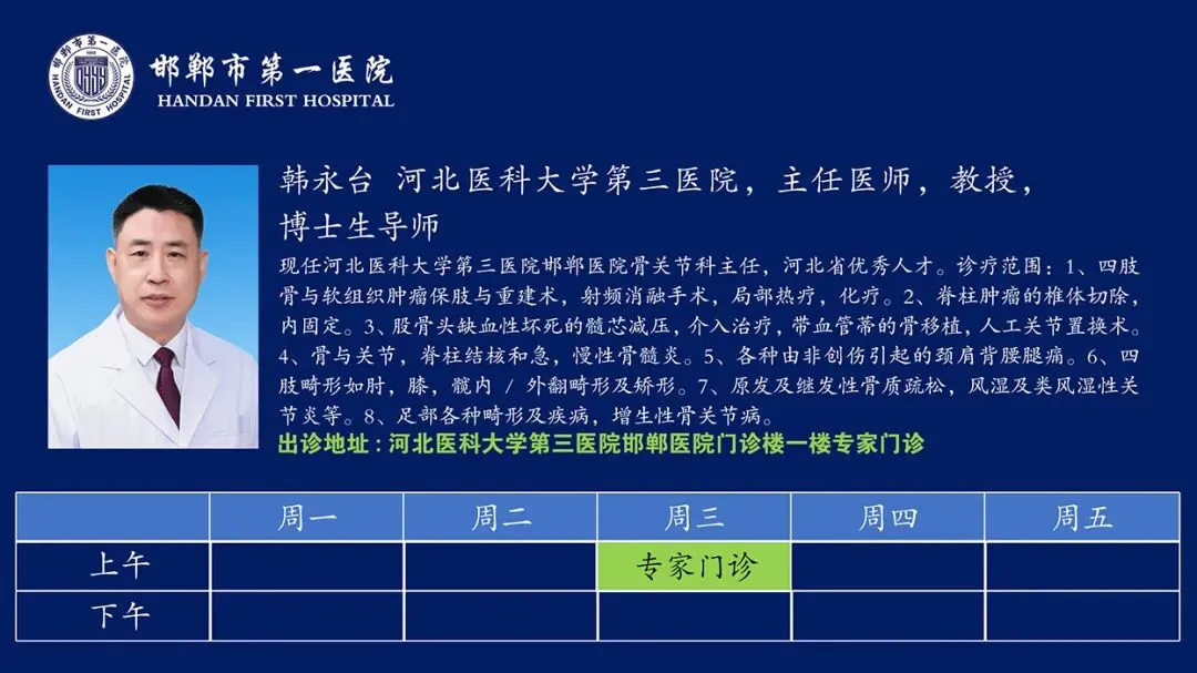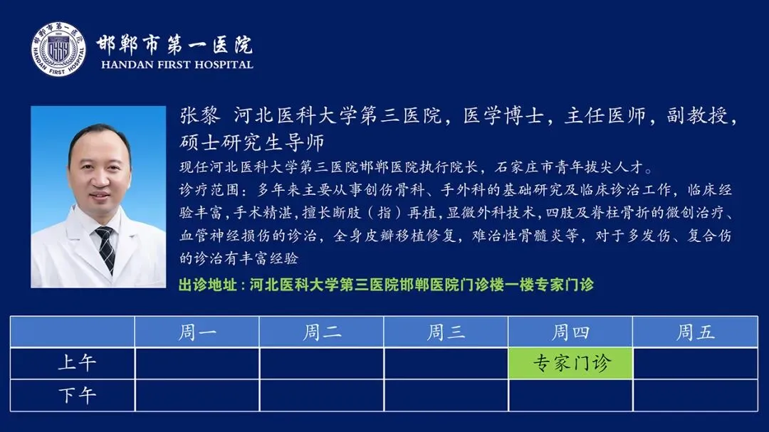 为让邯郸百姓足不出市就能享受到顶级专家优质医疗服务,在市委市政府正确领导下,2024年12月26日,河北医科大学第三医院邯郸医院终于正式运营。2026年1月5日,河北医科大学第三医院驻邯郸市第一医院骨科院区专家团队进行了轮换。张黎教授、河北医科大学第三医院邯郸医院执行院长,韩永台教授、骨关节科主任,曹俊明教授、邯郸医院主任,曹进超教授、小儿骨科主任,四位专家正式入驻。出诊信息如下: