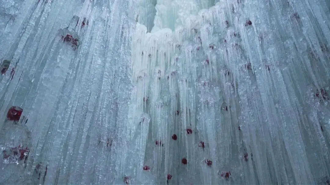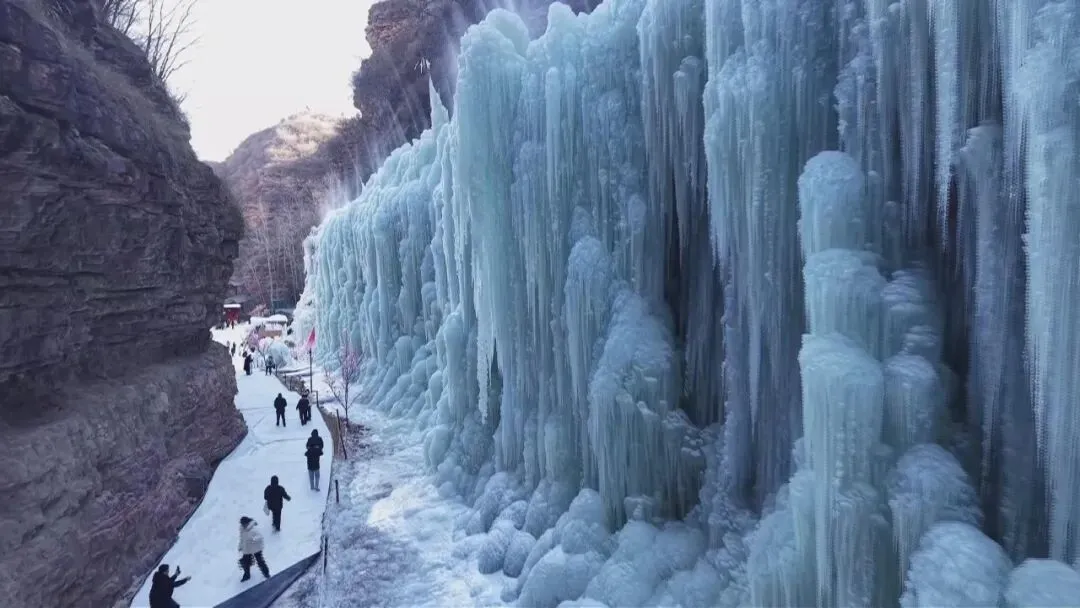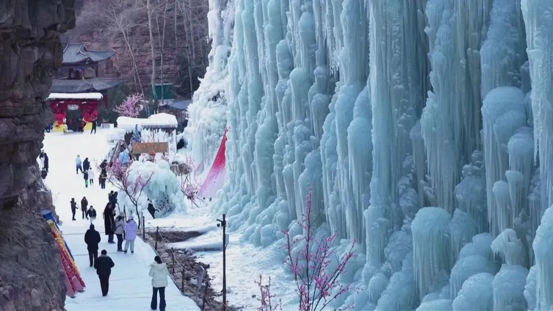 穿过滑雪场,200多米长的太行雪乡沿崖壁绵延。厚实的积雪最深处近1米,木制围栏、红色碎花装饰的东北风农家小院,尽显浓郁的雪乡风情。崖壁上,20多米长的冰挂如银河倾泻,阳光照射下晶莹闪烁;冰挂深处的冰封玫瑰更是将浪漫拉满,娇艳的玫瑰封存于寒冰之中,成为游客拍照打卡的必到之处。