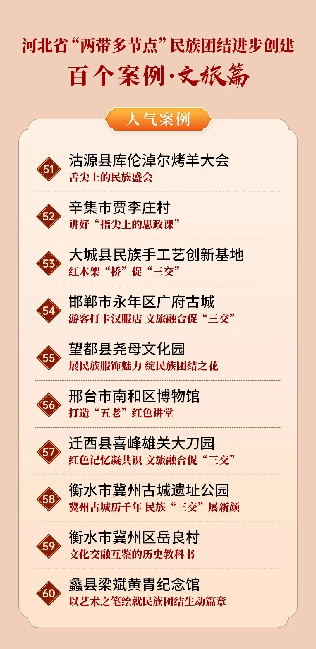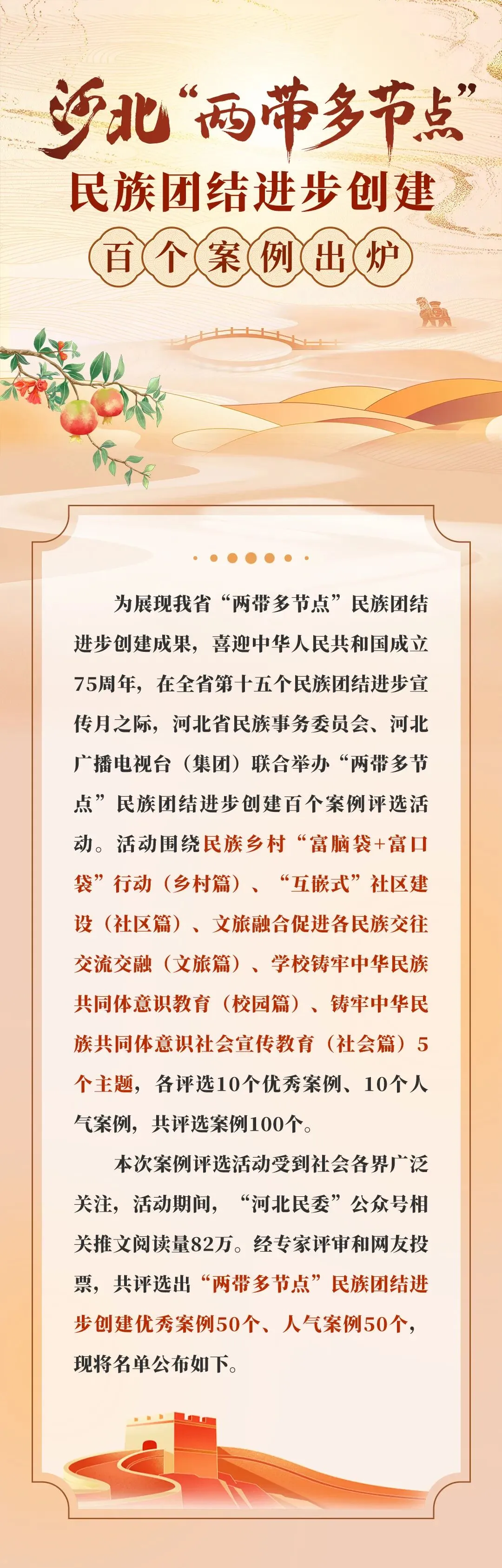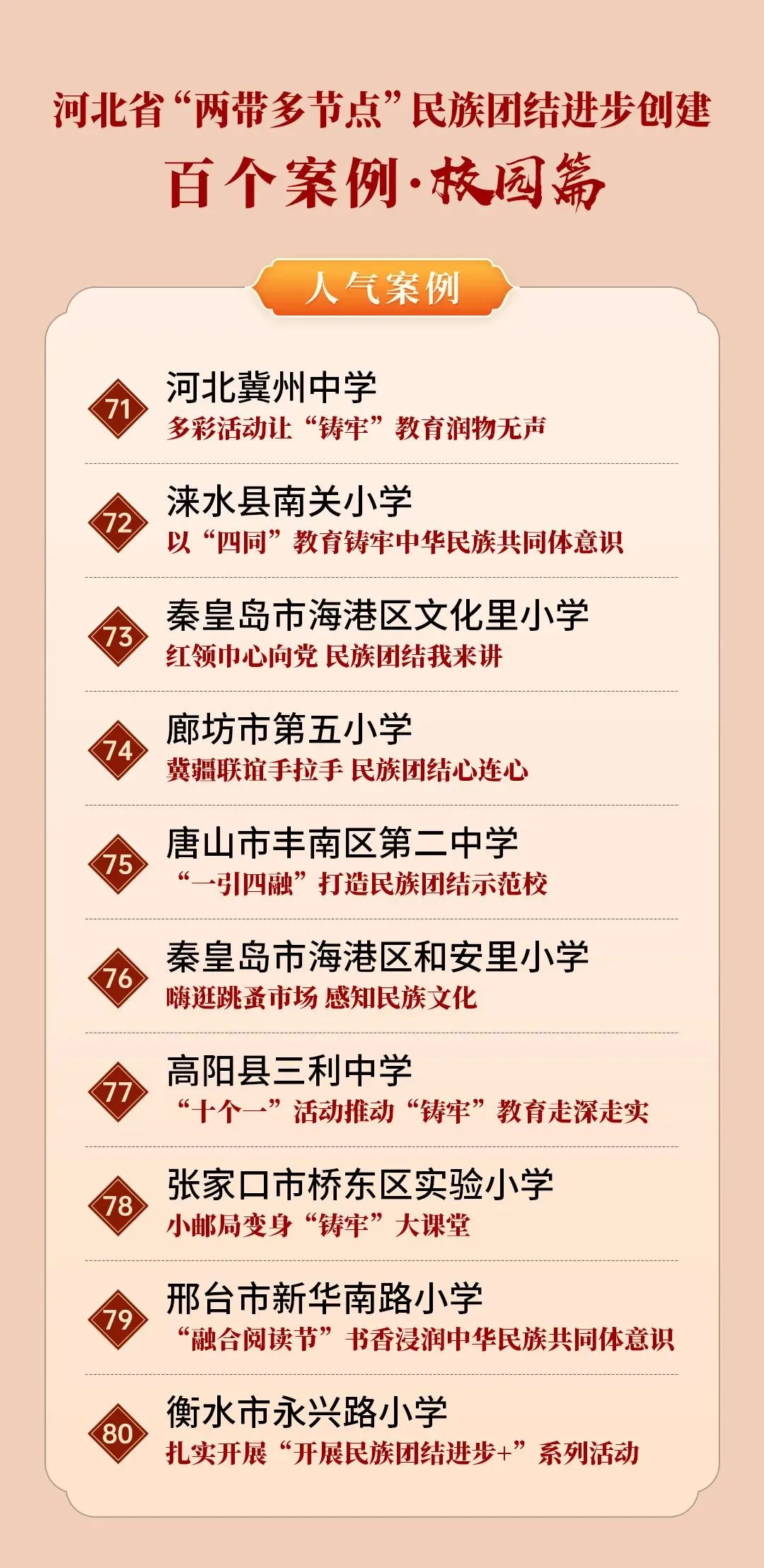 为展现河北省“两带多节点”民族团结进步创建成果,喜迎中华人民共和国成立75周年,在全省第十五个民族团结进步宣传月之际,河北省民族事务委员会、河北广播电视台(集团)联合举办“两带多节点”民族团结进步创建百个案例评选活动。活动围绕民族乡村“富脑袋+富口袋”行动(乡村篇)、“互嵌式”社区建设(社区篇)、文旅融合促进各民族交往交流交融(文旅篇)、学校铸牢中华民族共同体意识教育(校园篇)、铸牢中华民族共同体意识社会宣传教育(社会篇)5个主题,各评选10个优秀案例、10个人气案例,共评选案例100个。邯郸市丛台区曙光第四小学入选河北“两带多节点”民族团结进步创建百个案例(校园篇)。