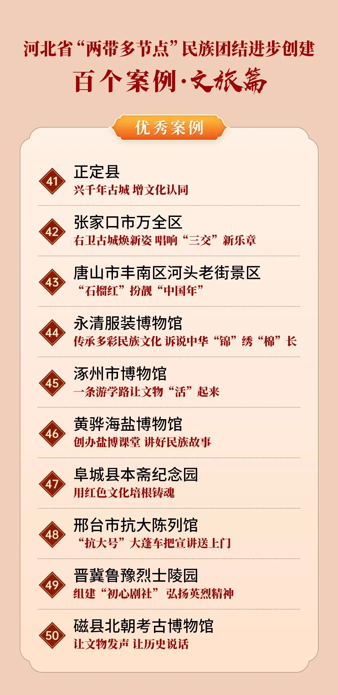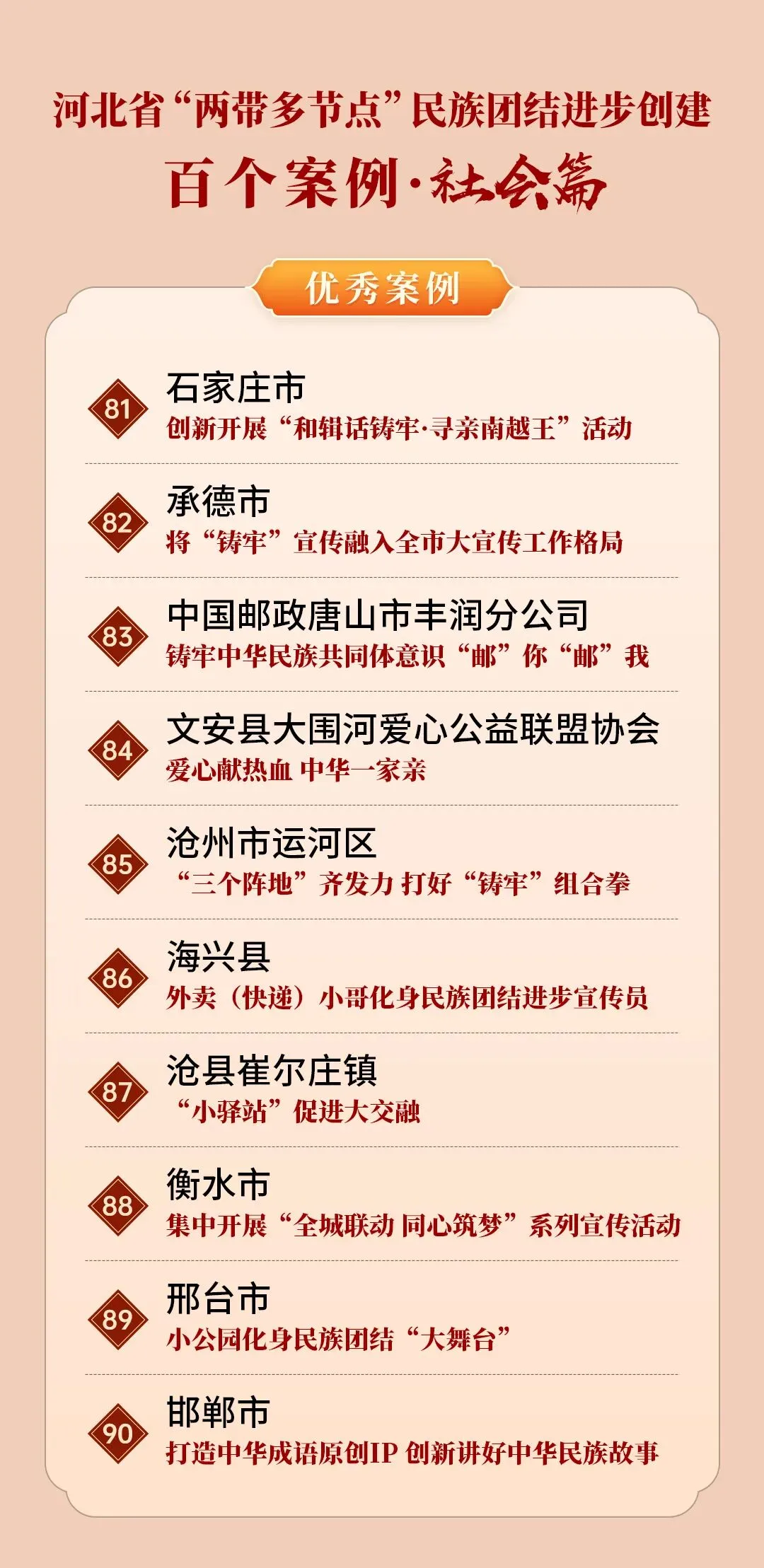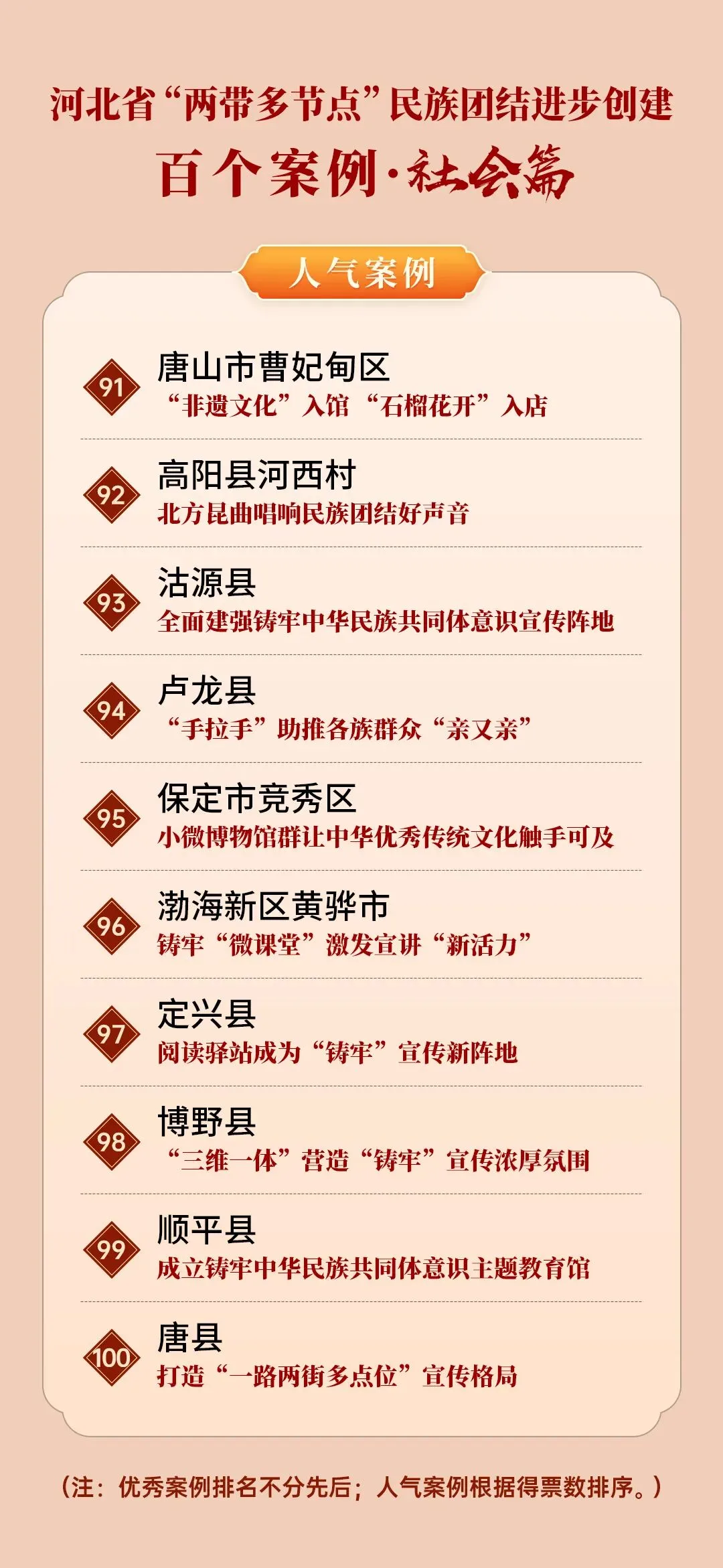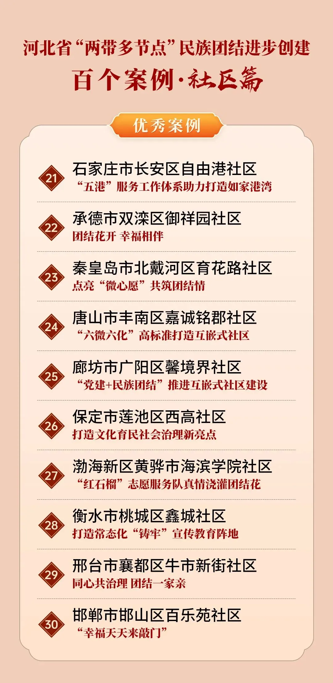 为展现河北省“两带多节点”民族团结进步创建成果,喜迎中华人民共和国成立75周年,在全省第十五个民族团结进步宣传月之际,河北省民族事务委员会、河北广播电视台(集团)联合举办“两带多节点”民族团结进步创建百个案例评选活动。活动围绕民族乡村“富脑袋+富口袋”行动(乡村篇)、“互嵌式”社区建设(社区篇)、文旅融合促进各民族交往交流交融(文旅篇)、学校铸牢中华民族共同体意识教育(校园篇)、铸牢中华民族共同体意识社会宣传教育(社会篇)5个主题,各评选10个优秀案例、10个人气案例,共评选案例100个。邯郸市丛台区曙光第四小学入选河北“两带多节点”民族团结进步创建百个案例(校园篇)。