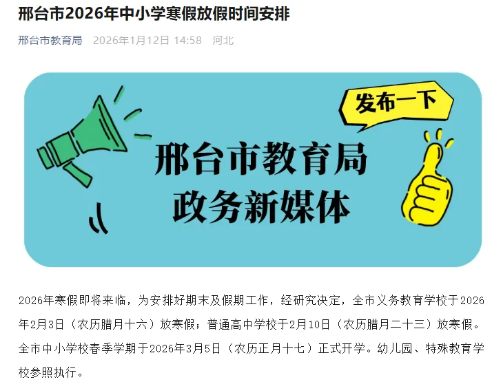 为切实做好2026年全市中小学(园)寒假前后工作,市教育局对寒假及春季开学做出如下安排。