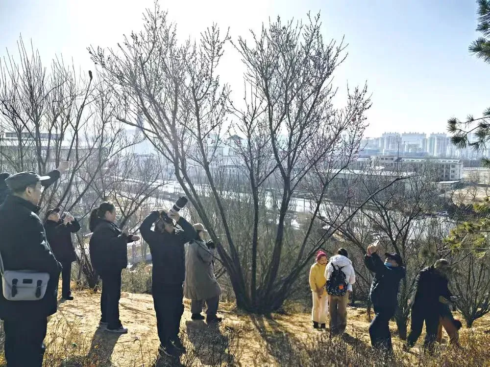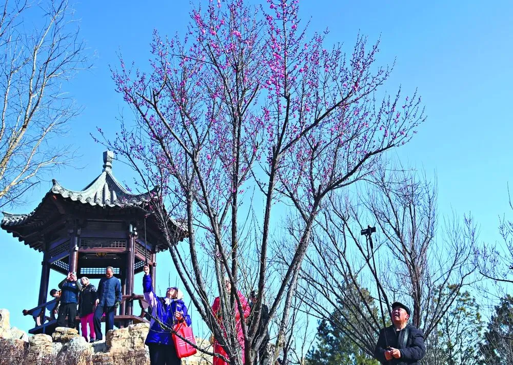 开得最好的,是山顶六角亭南侧的那株红梅,也是近日在抖音、小红书上悄然走红的那株“网红树”。树下早已围满赏花人,因地势倾斜,有人立于亭边俯拍,有人在坡下仰摄,快门声此起彼伏。这株红梅生得格外高挺,四周无遮无拦,将阳光尽揽入怀。尤其当那疏影横过亭檐,二者一静一动、一古一艳,相映成趣。“开放的红梅,古朴的亭子,还有冬日里的蓝天,交融在一起,就像一幅浑然天成的画。”正在赏花的市民刘先生笑着赞叹,“没想到石家庄的冬天,美得这般有诗意。”