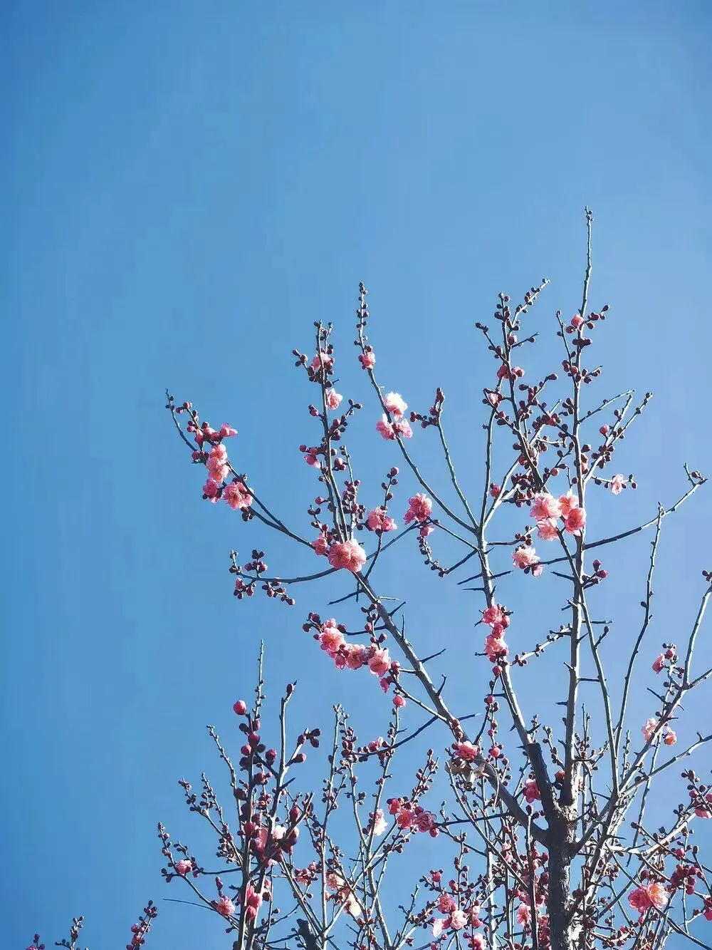 山顶开放的红梅与蓝天浑然天成,如一幅画。