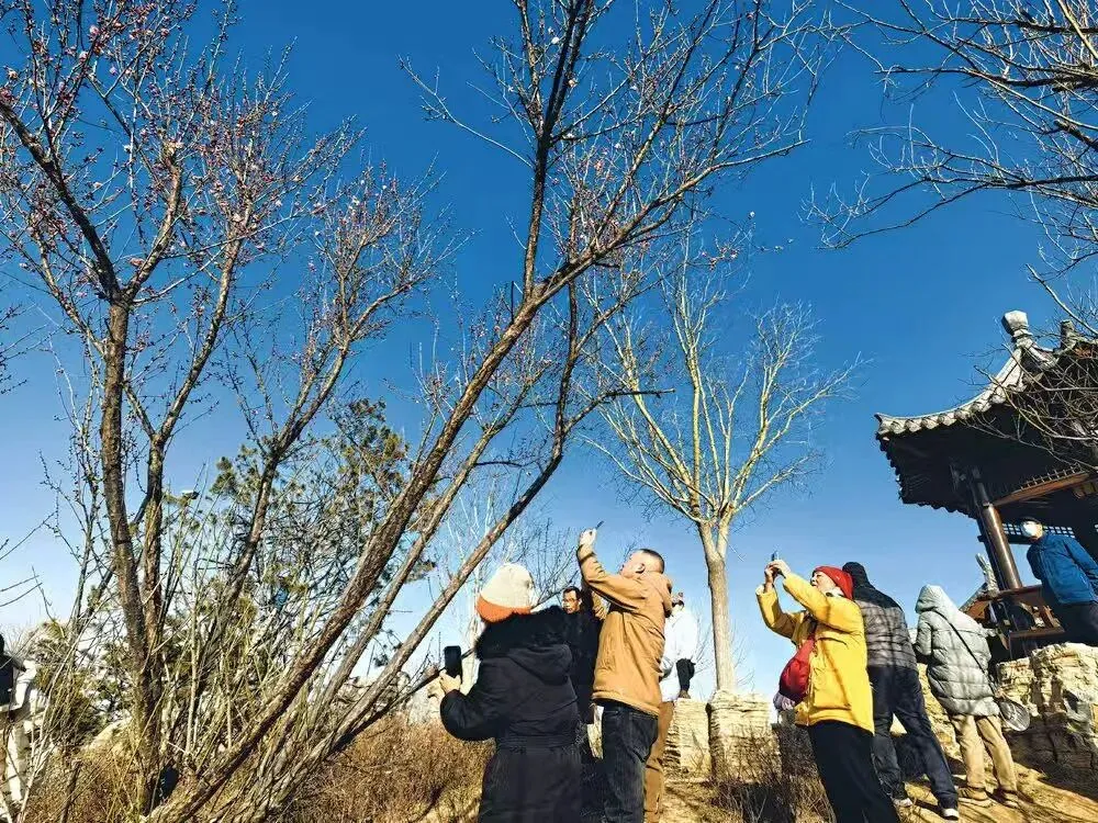 在万物萧疏的三九寒天,石家庄梅岭春早公园的几株红梅开花吐蕊。疏影横斜间,花开不语,引来人潮驻足。人们举起手机或相机,定格这抹冬日里的温柔。
