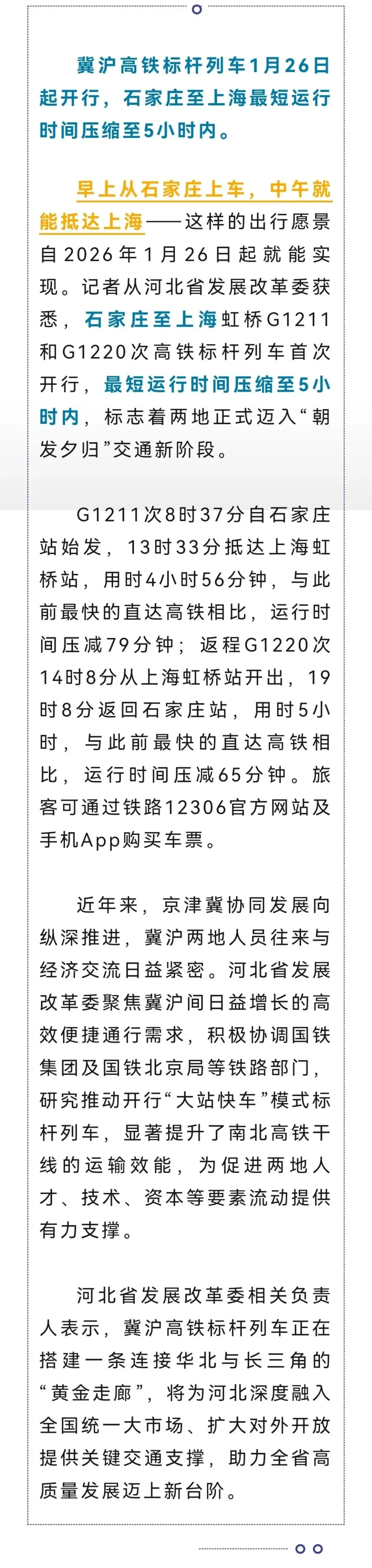>石家庄出发,5小时内到上海!这趟高铁1月26日起开行