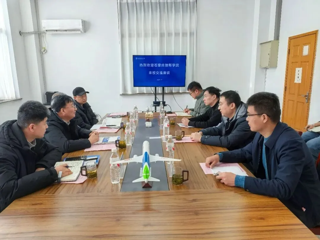 1月13日石家庄技师学院院长、党委副书记方建京一行4人到校交流座谈。学校党委副书记商灵默陪同,航空机电系主任石进水等参加。