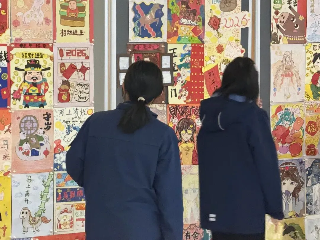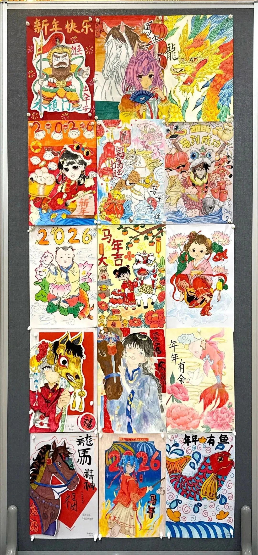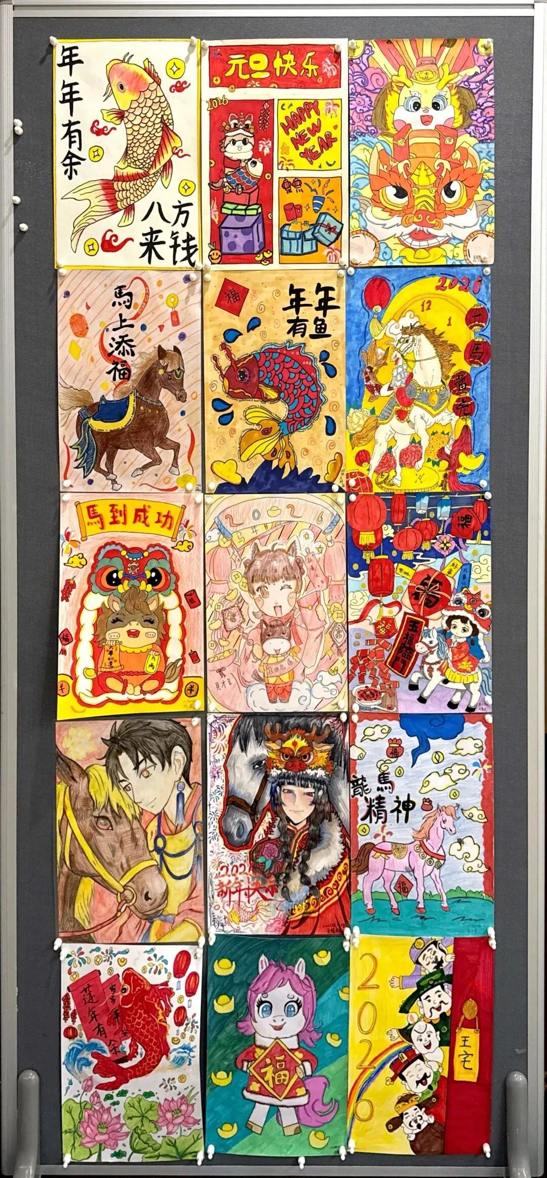近日,“驰春纳福”艺术展在我校顺利启幕。一幅幅骏马主题的年画、一张张精巧灵动的剪纸作品,将传统年俗韵味、马年喜庆氛围与校园文化活力深度交融,为即将到来的马年新春营造出浓厚的迎新气息。
