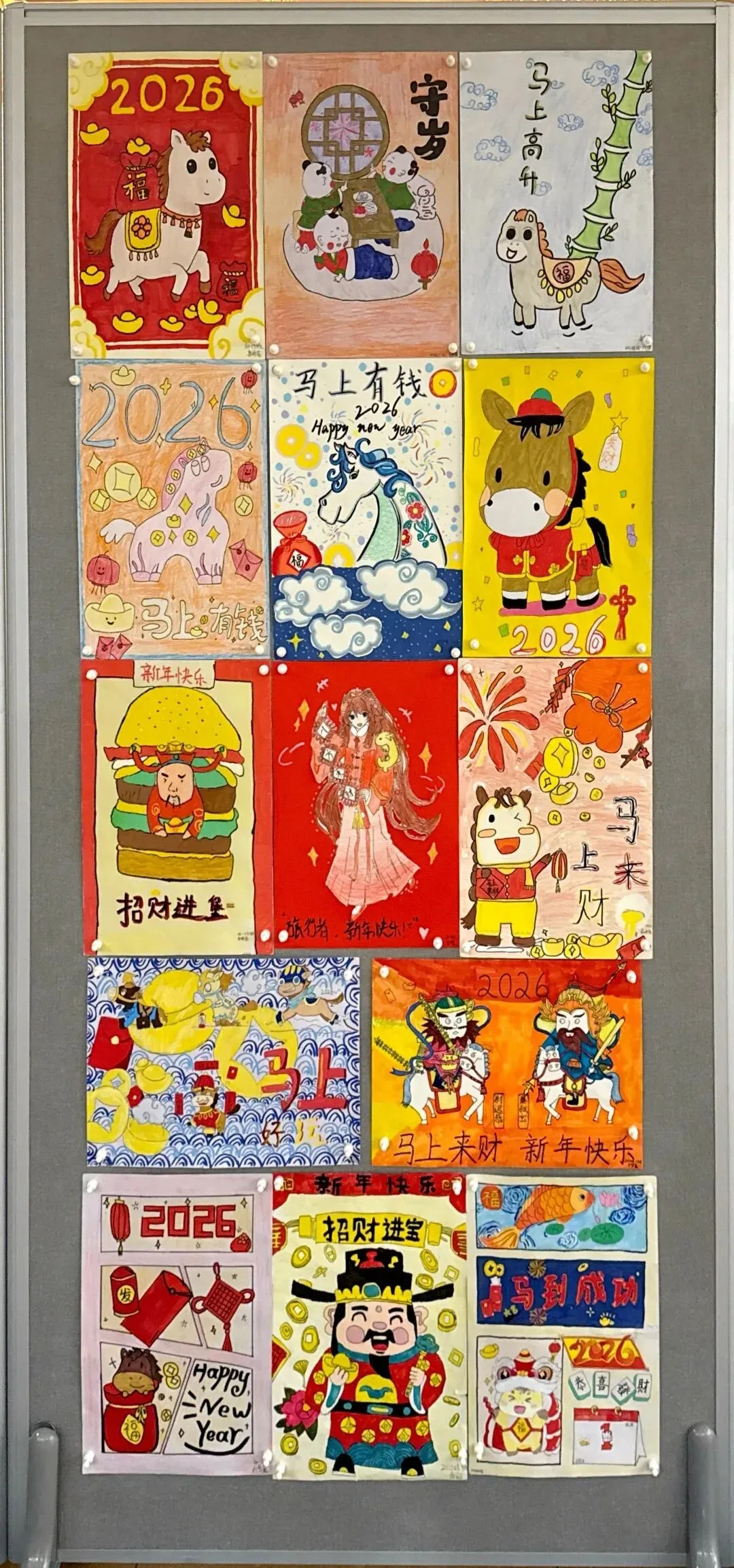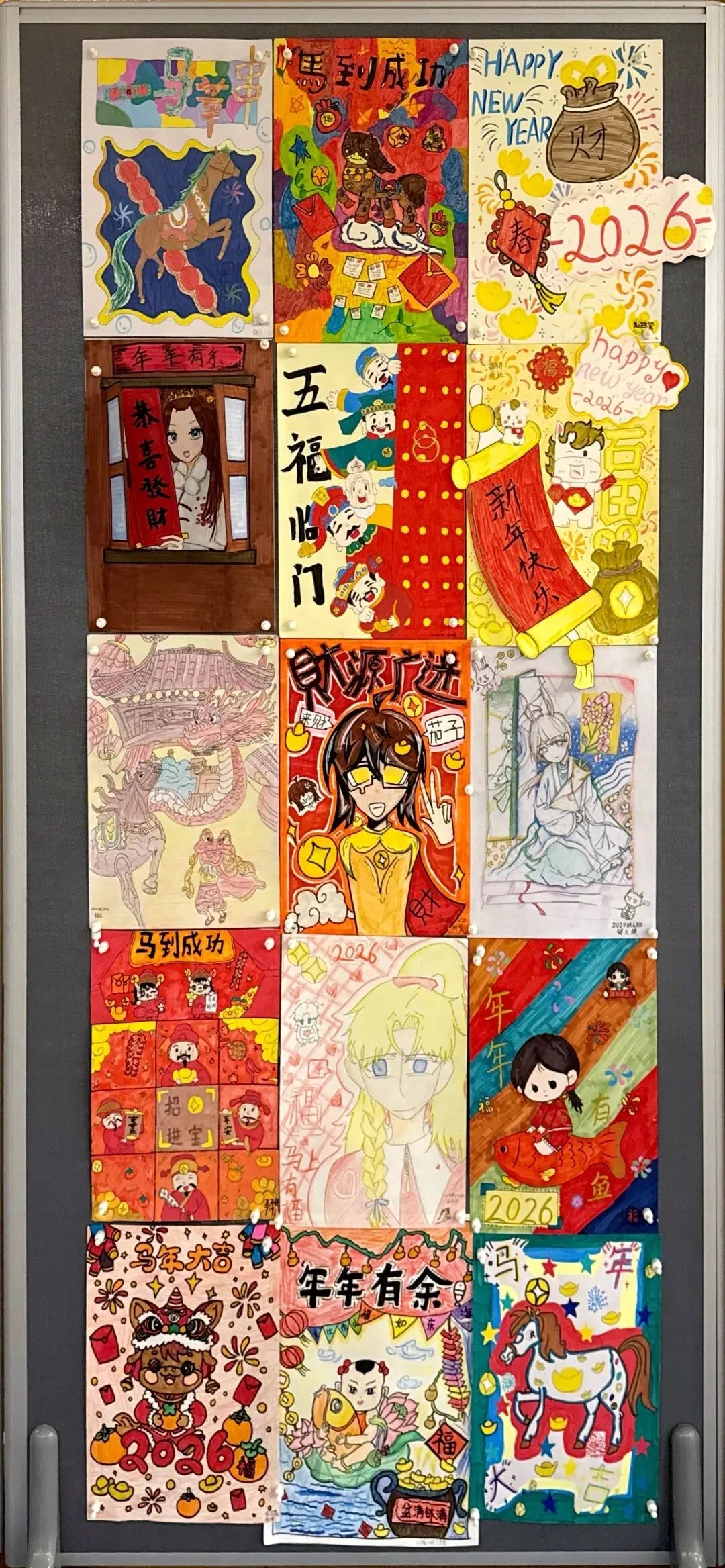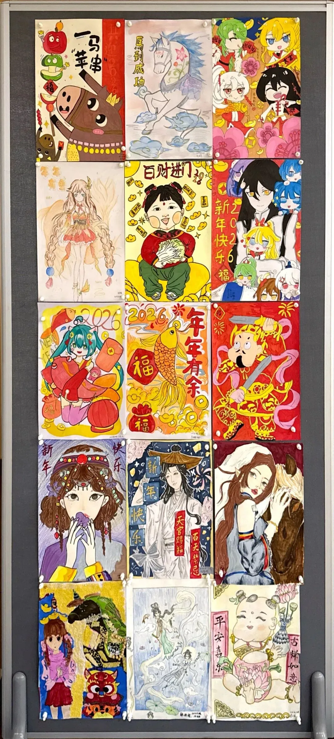 近日,“驰春纳福”艺术展在我校顺利启幕。一幅幅骏马主题的年画、一张张精巧灵动的剪纸作品,将传统年俗韵味、马年喜庆氛围与校园文化活力深度交融,为即将到来的马年新春营造出浓厚的迎新气息。