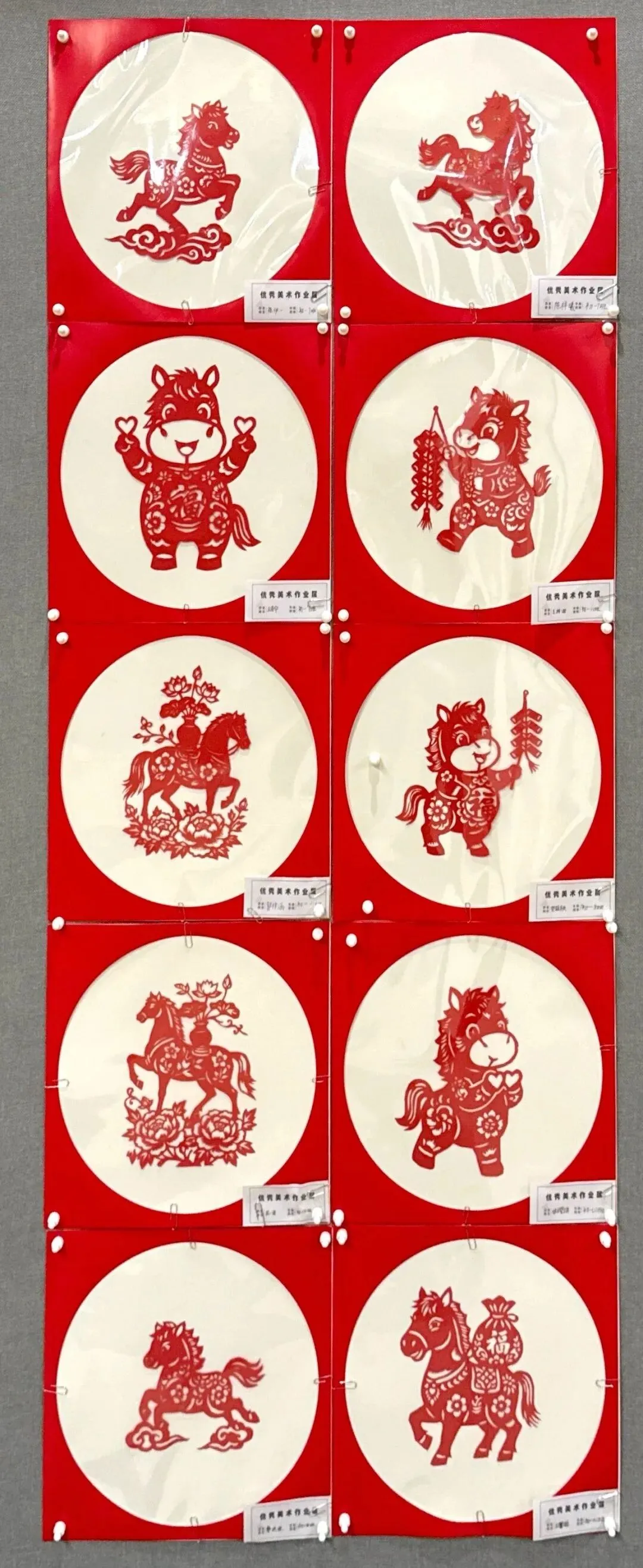 剪纸作品以中国红为基底,学生们通过灵巧刀工刻画出骏马英姿:或腾云疾驰象征新年奋进,或驮福而行寓意吉祥安康。