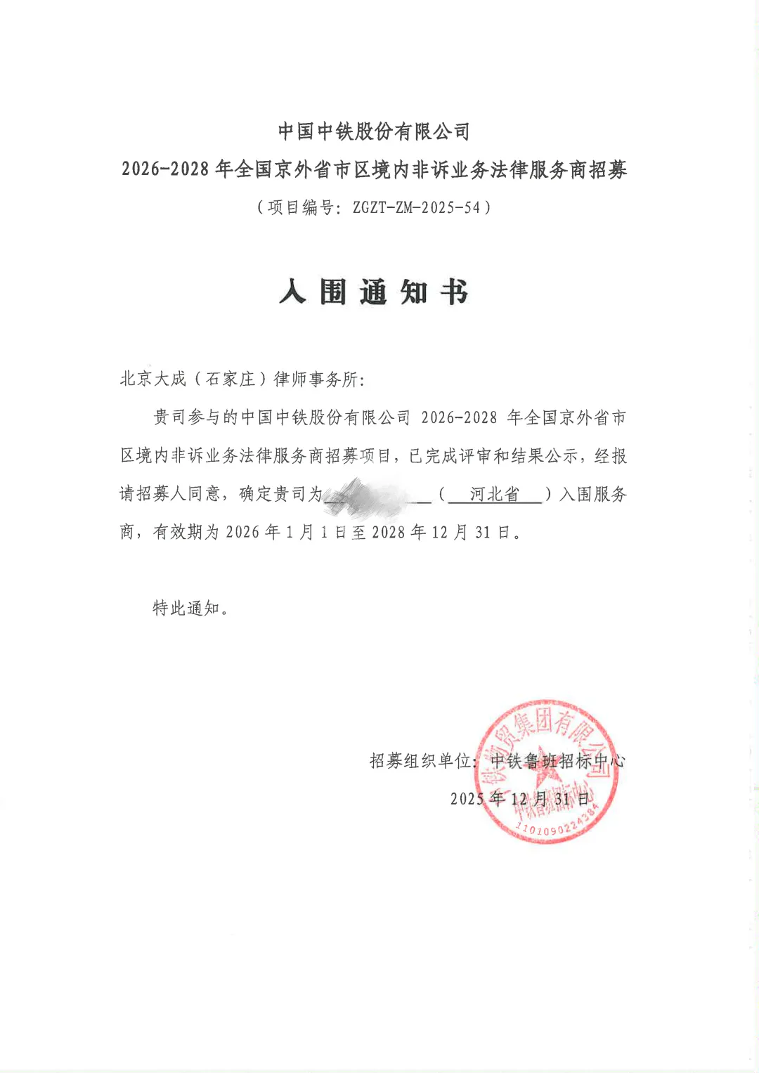 此次成功中标,既是中国中铁对大成律师职业素养、专业能力与服务水平的充分肯定和认可,更是大成石家庄与河北省内中国中铁系统深化合作的新起点。大成石家庄将以此为契机,汇聚“全球资源、本土智慧”,秉承“为客户提供及时、便捷、优质、高效、高性价比服务”理念及“为客户创造价值”宗旨,不断提升大成美誉度和品牌影响力,不断提高法律服务专业能力和水平,为河北省区域内中国中铁旗下公司的合规运营、稳健发展以及争议解决提供坚实有力的法律保障,共同书写“专业赋能、合作共赢”的新篇章。