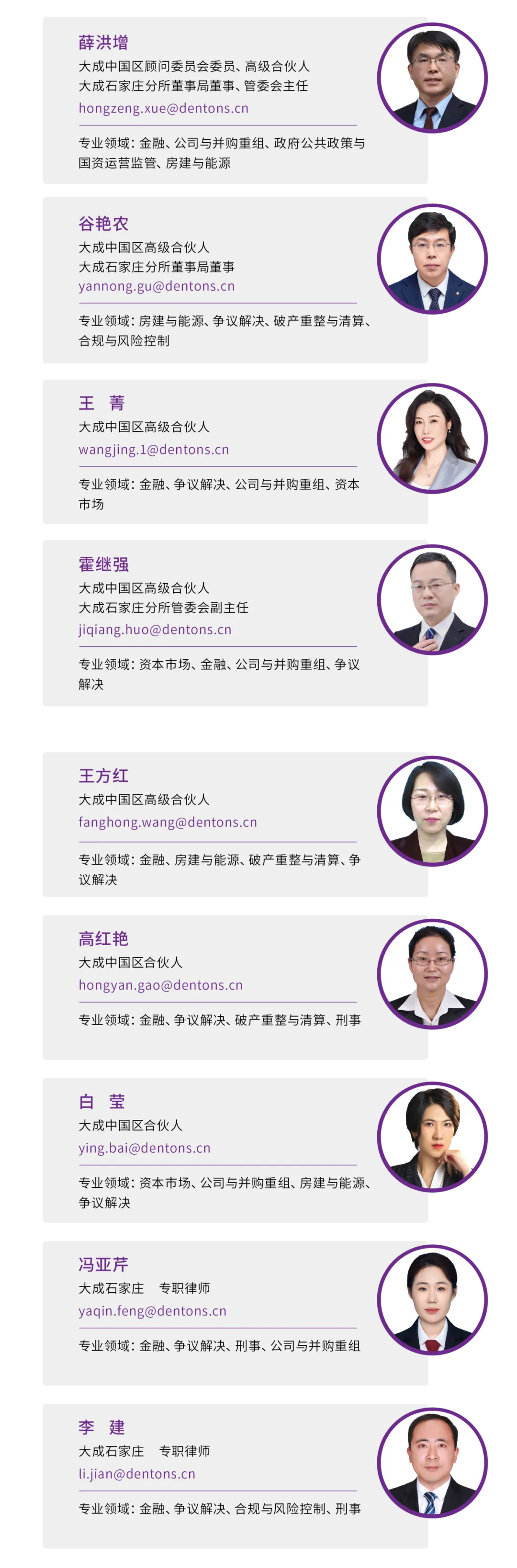 本次入选的律师团队由大成中国区顾委会委员、高级合伙人、大成石家庄管委会主任薛洪增律师牵头,与高级合伙人谷艳农、王菁、霍继强、王方红,权益合伙人高红艳、合伙人白莹及冯亚芹、李建等多名律师共同组成。团队成员长期深耕于建设工程、基础设施、企业合规等诉讼和非诉讼领域,在建设工程施工合同纠纷、不良资产处置、企业改制、项目收购、公司重整等法律服务领域拥有丰富的实战经验、深厚的专业积淀和卓越的团队协同能力,长期为多家大型央企、国企、民营企业以及省市级政府机关提供重大争议解决、尽职调查、出具法律意见书及常年法律顾问等服务。