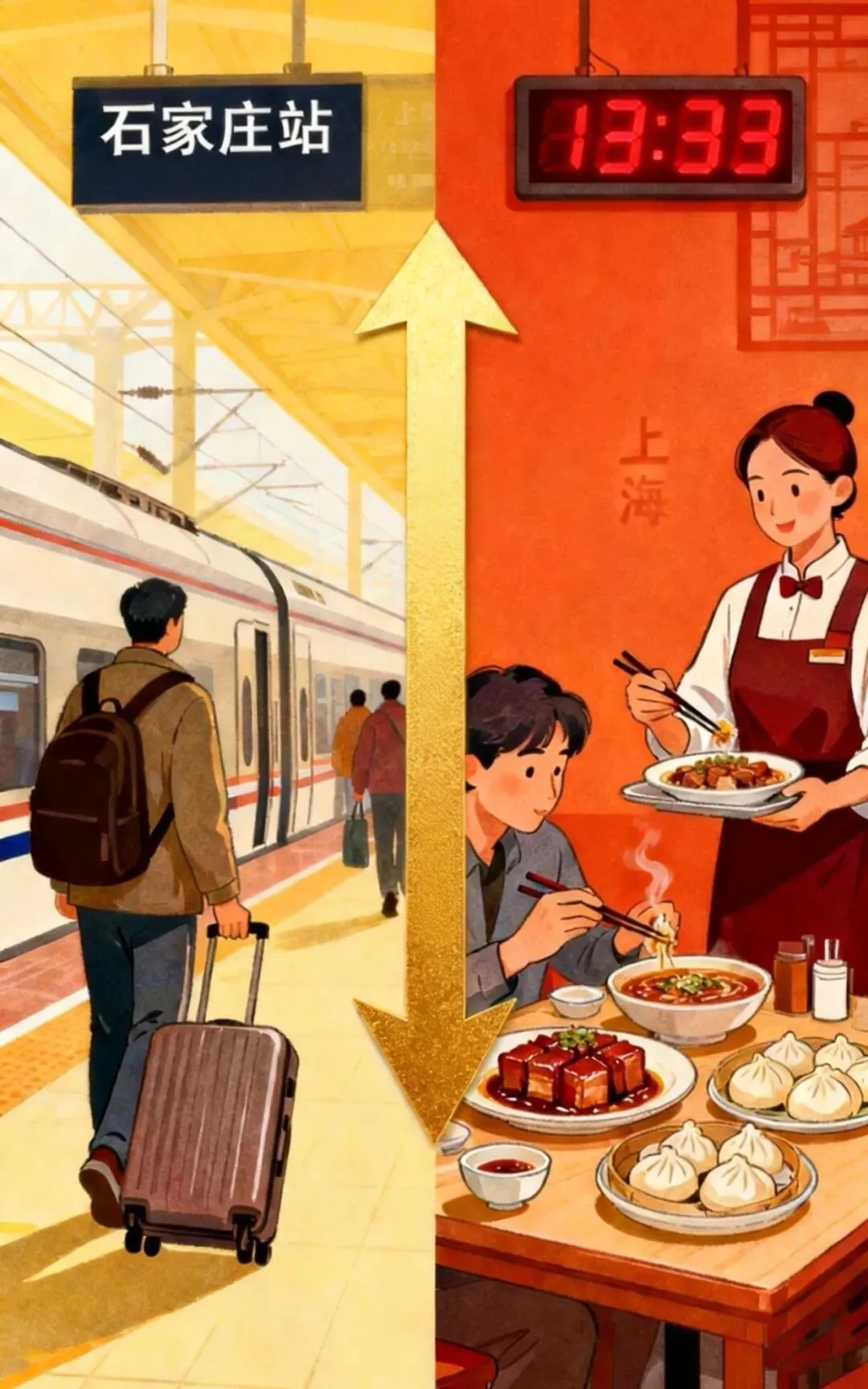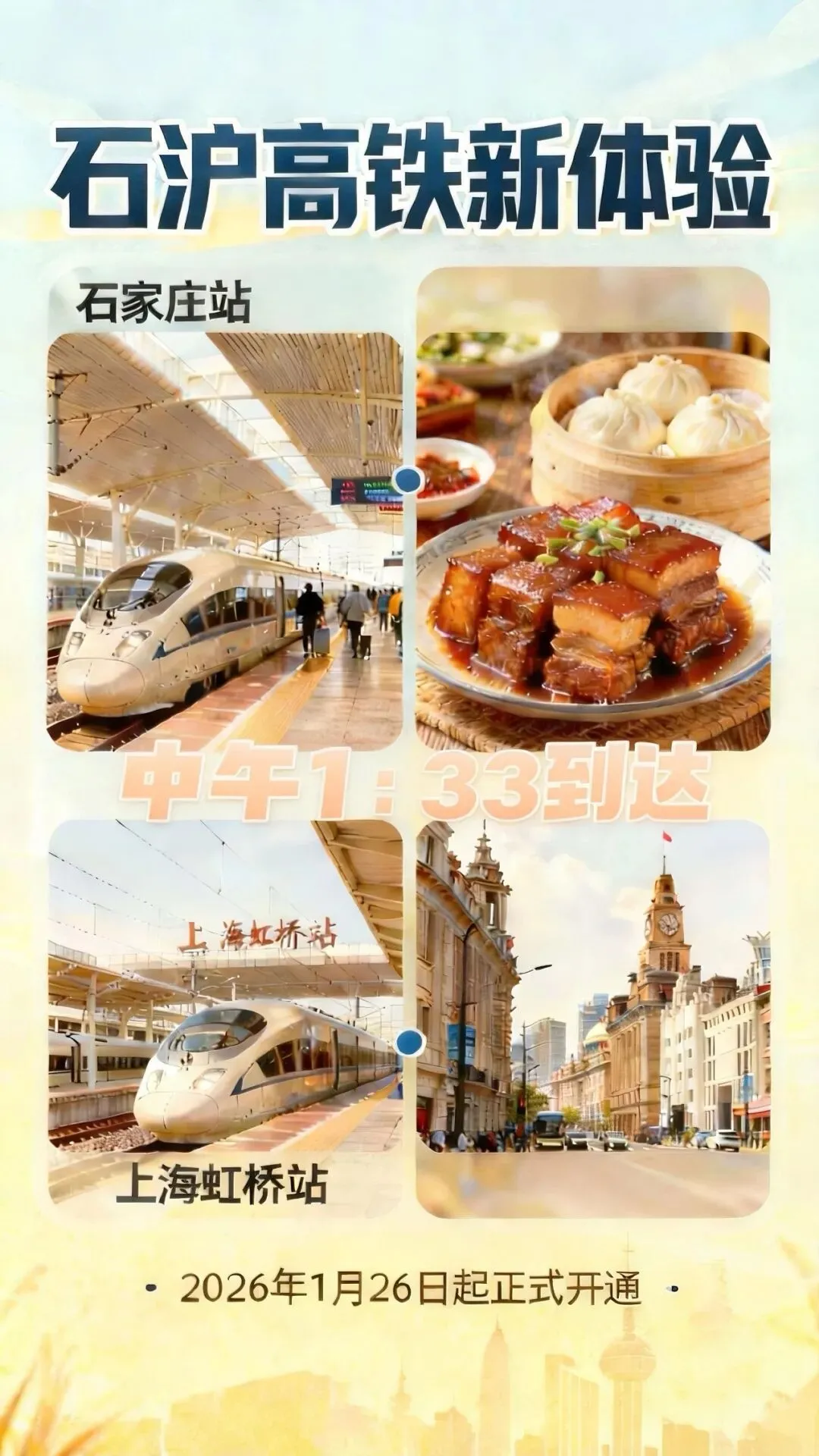早晨从石家庄上车,中午就能在上海品尝地道的本帮菜——这样的出行愿景,2026年1月26日起正式成为现实。石家庄至上海首次开行标杆高铁列车,历史性突破5小时,单程运行时间4小时56分钟,标志着两地正式迈入“朝发夕归”交通新阶段。