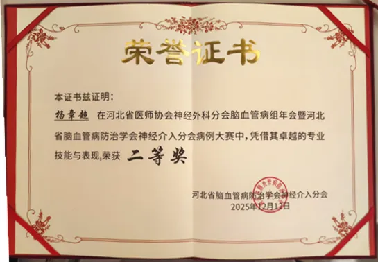 在同期举办的河北省医师协会神经外科分会脑血管病组年会暨河北省脑血管病防治学会神经介入分会病例大赛中,来自省内多家知名医院的优秀医师同台竞技,展示了精湛的技艺与深厚的临床功底。经过激烈角逐,邯郸市中心医院神经外一科杨章超医师凭借其参赛的典型病例、清晰的诊疗思路、严谨的临场分析与沉着稳健的答辩表现,在众多高手中脱颖而出,荣获大赛二等奖。这一佳绩充分体现了杨章超医师扎实的专业基础、出色的临床思维能力以及解决复杂脑血管疾病的技术水平,也彰显了医院神经介入团队在人才培养和临床实力方面的卓越成果。