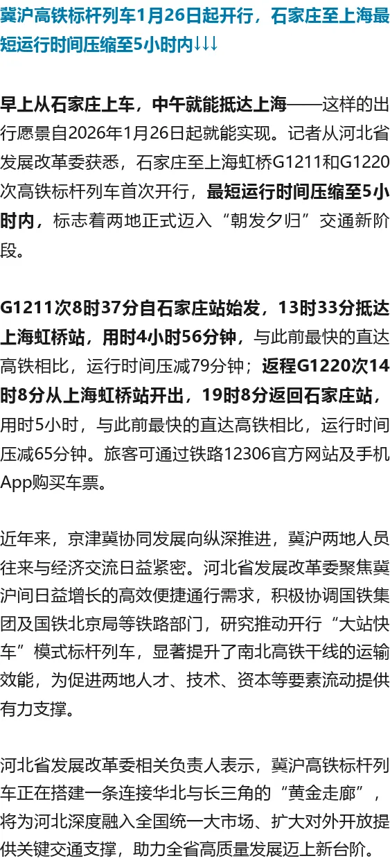 >石家庄到上海5小时!冀沪高铁标杆列车来了!