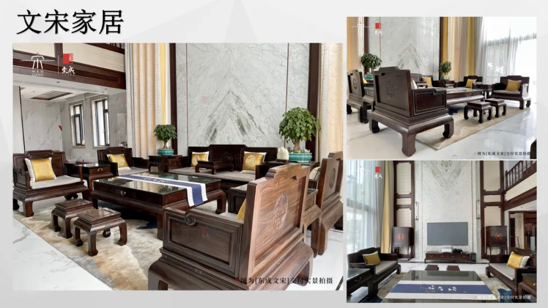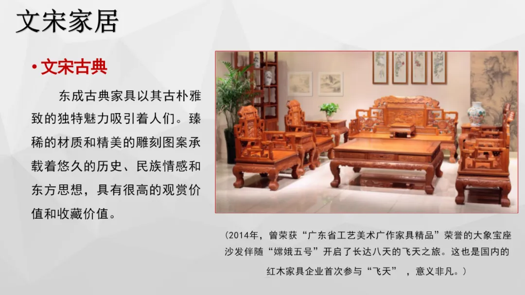 东成古典红木家具以古朴雅致的格调惊艳时光,臻稀材质与精美雕刻承载着悠久历史、民族情感与东方思想,不仅具备极高的观赏价值,更拥有深厚的收藏底蕴——2014年,荣获"广东省工艺美术广作家具精品"的大象宝座沙发伴随"嫦娥五号"飞天,成为国内红木家具企业参与航天事业的里程碑事件。文宋新中式红木家具则以宋代士大夫文化为精神内核,选用名贵阔叶黄檀为主材,将传统韵味与现代实用风格完美融合,其望岳罗汉床曾斩获2018年"省长杯"设计大赛银奖,成为当代中式家具的标杆之作。