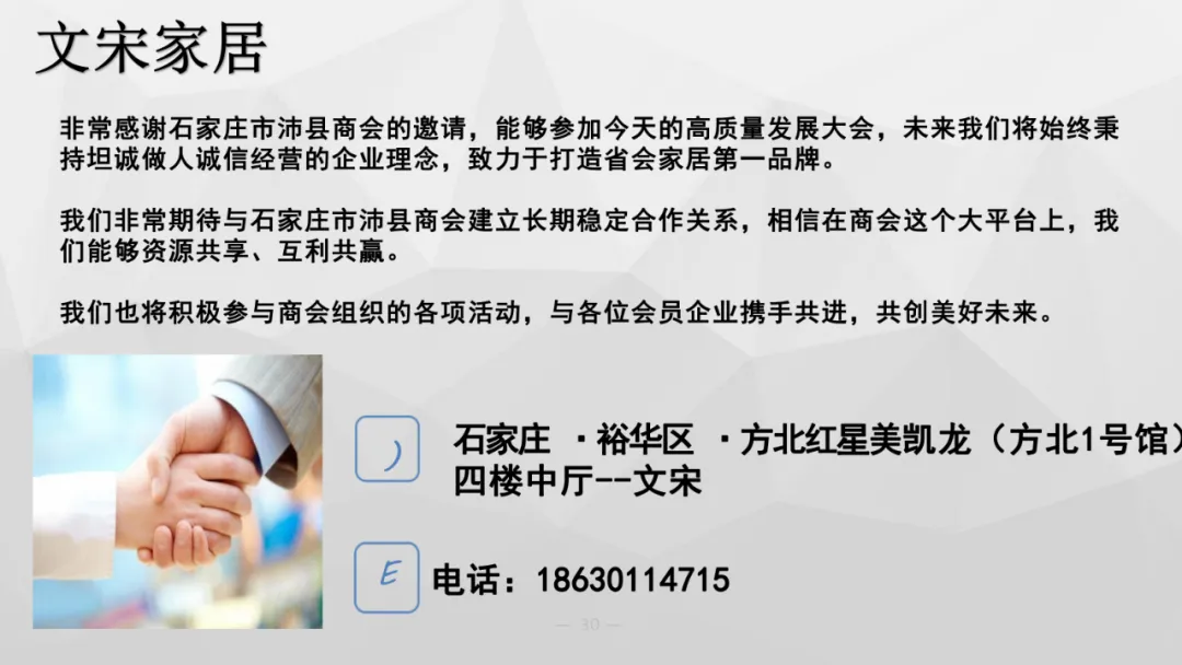 文宋家居始终秉持"坦诚做人、诚信经营"的企业理念,以"提供优质产品与服务"为使命,坚守"以品质铸就品牌,以服务成就未来"的核心信念,致力于打造省会家居第一品牌。此次与石家庄市沛县商会达成战略合作,是文宋家居拓展发展边界、深化区域合作的重要举措。未来,文宋家居将依托商会的优质平台资源,与各位会员企业深度联动,共享品牌优势、渠道资源与服务经验,在家居零售、定制服务、客户资源等方面实现互利共赢,同时积极参与商会组织的各项活动,与各企业携手共进,为省会家居产业升级与区域经济高质量发展贡献更大力量。