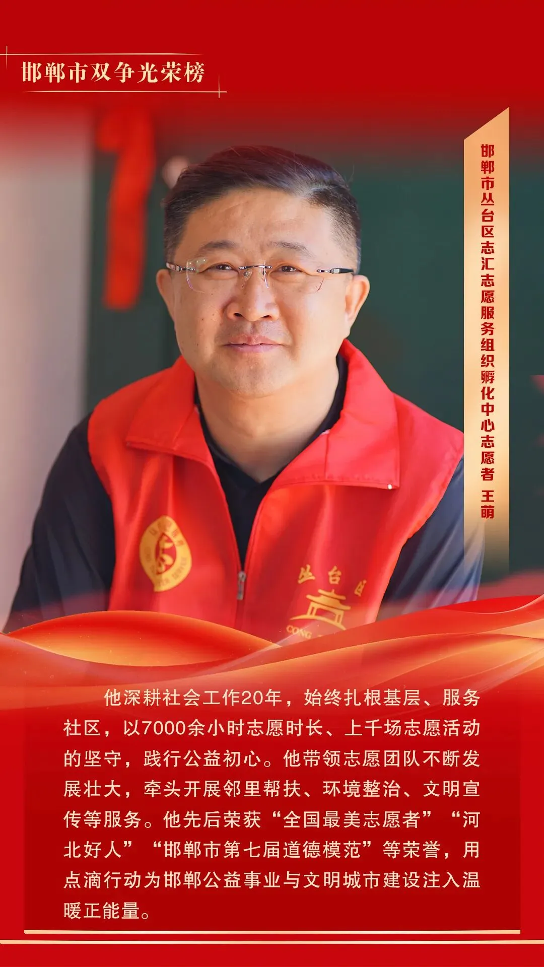 近日,邯郸市2025年12月“双争光荣榜”出台,丛台区志汇志愿服务组织孵化中心王萌同志荣登全市12月份“双争光荣榜”。二十载志愿路:王萌与邯郸大地上的爱心传递