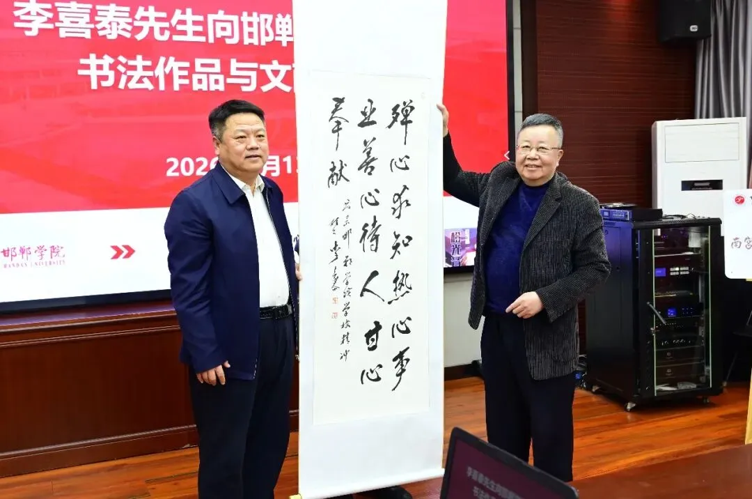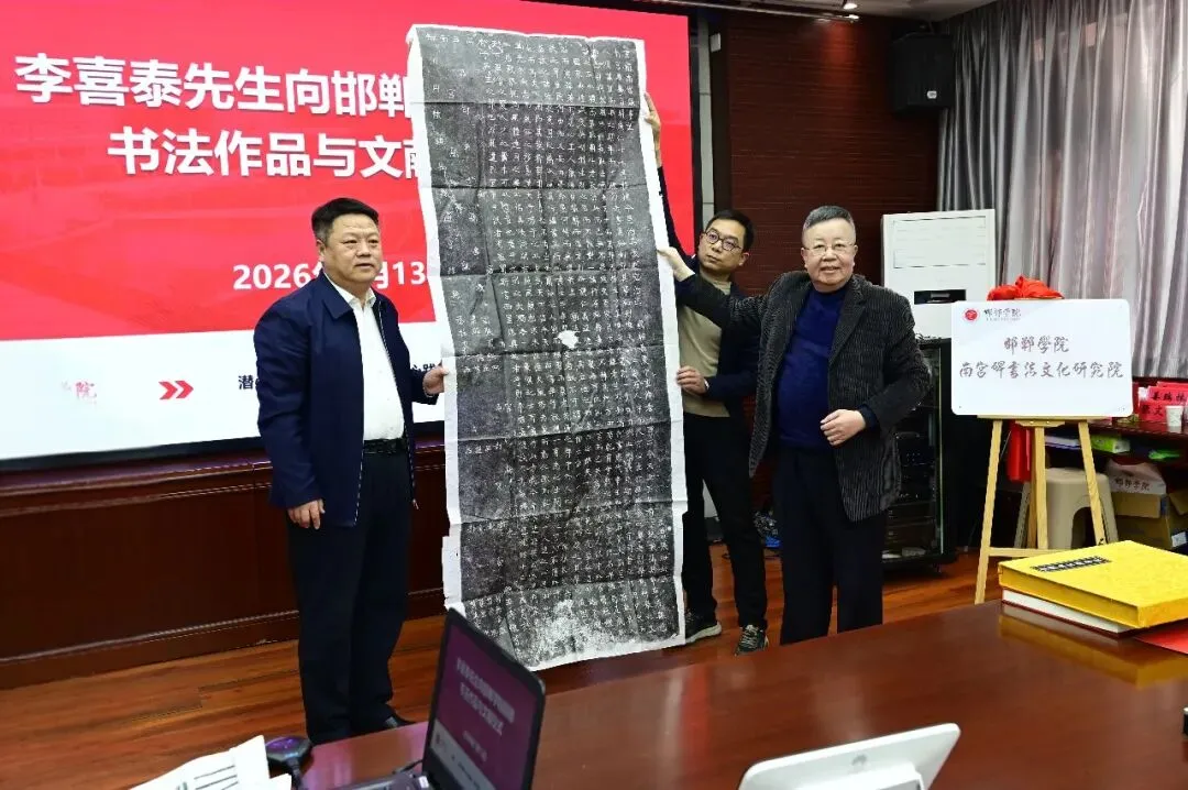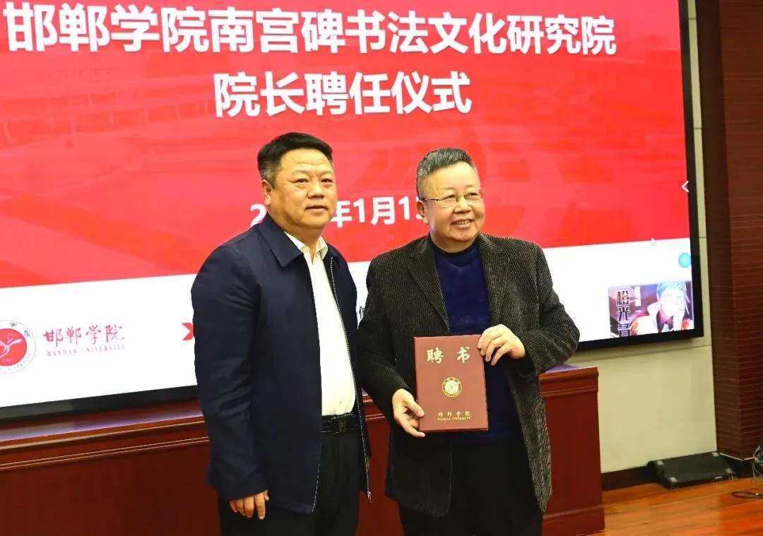 2026年1月13日,邯郸学院南宫碑书法文化研究院成立仪式在邯郸学院隆重举行。这是邯郸学院依托学科人才优势,联合邯郸市南宫碑书法协会打造的高校南宫碑书法文化研究平台,标志着河北省非物质文化遗产南宫碑体书法的保护传承迈入“学术研究、人才培养、文化传播、活化利用”四位一体的系统化发展新阶段。南宫碑体是曾国藩四大门人之一的清末桐城派文宗、书坛泰斗张裕钊先生所创,被康有为誉为“千年以来无与比”。清末书法大家康有为、沈曾植、革命先驱孙中山等都曾研习南宫碑体。南宫碑体在邯郸历经六代人的传承从未间断,彰显出了邯郸独特的书法文化身份,形成了靓丽的南宫碑体书法文化风景线。作为邯郸文化品牌,南宫碑体承载着邯郸精神品格和理想追求,是增强邯郸文化软实力的重要依托。邯郸学院校长王宪明在致辞中指出,书法艺术,是中华优秀传统文化的瑰宝,承载着中华民族的精神基因与审美追求。南宫碑体书法,作为植根于燕赵沃土、具有独特艺术风貌与深厚历史底蕴的书法流派,已被列入河北省非物质文化遗产名录。它不仅是冀南地区文化脉动中的重要音符,更是邯郸地域文化自信的生动体现。邯郸学院作为一所地方应用型本科院校,始终将服务地方文化传承与创新作为自己的重要使命。我们深知,高校不仅是知识传授的场所,更应是文化传承的高地、文明创新的引擎。今天,南宫碑书法文化研究院的成立,正是我校积极整合校内学科与人才资源,携手邯郸市南宫碑书法协会等社会力量,共同推动非物质文化遗产保护、研究与活化利用的关键举措。研究院的成立,旨在打造一个集学术研究、人才培养、文化传播、社会服务于一体的高水平平台。我们将依托此平台系统梳理与挖掘南宫碑书法的历史渊源、艺术特色、理论体系与时代价值,夯实学术根基,打造冀南地区乃至全省有影响力的书法文化研究高地;非遗资源转化为优质育人资源,通过课程建设、实践教学、大师引领等方式,培养兼具传统功底与创新精神的书法艺术后继人才;通过展览、讲座、出版、数字化等多种形式,推动南宫碑书法艺术走进校园、走向社会、走入大众,提升其影响力与美誉度;积极探索书法艺术与当代文化创意产业、城市美育、文旅融合的结合点,为邯郸文化强市建设贡献高校的智慧与力量。邯郸市文联主席王金东、副主席李雪明参加了成立大会。王金东主席表示,南宫碑体是省级以上唯一的书法类非物质文化遗产,这一书法流派不仅承载着“弘道养正”的文化精神,更凝结着中华美学的独特追求,是邯郸地域文化的鲜明标识,更是中华民族文化基因的重要组成部分。非遗的生命力在于传承,传承的关键在平台,平台的核心在协同。邯郸学院作为冀南地区重要的人才培养与文化研究阵地,拥有深厚的学科积淀与人才优势;邯郸市南宫碑书法协会汇聚了业界精英,承载着传承发展的使命担当。此次双方携手共建研究院,既为南宫碑体书法提供了专业化的研究阵地,也为高校服务地方文化建设开辟了新路径,更让我们看到了非遗传承"产学研用"深度融合的广阔前景。这种校地联动、优势互补的模式,正是新时代非遗保护传承的必由之路,必将为邯郸文化强市建设注入强劲动力。希望研究院深耕学术根基,系统挖掘南宫碑书法文化,让这一非遗技艺的文化内涵得到更充分的阐释;希望研究院创新传承路径,将非遗资源转化为育人资源,培养更多兼具传统底蕴与创新思维的青年传承人,让古老艺术在校园焕发新生;希望研究院拓宽传播视野,既要立足邯郸,办好学术研讨、公益课堂等活动,更要面向全国乃至世界,讲好南宫碑体的文化故事,让这一文化瑰宝在新时代绽放更绚丽的光彩。 邯郸市文联将始终作为研究院发展的坚强后盾,全力支持各项工作开展,积极搭建交流平台,推动南宫碑体书法与现代生活、文化产业深度融合。我们坚信,在各方的共同努力下,南宫碑书法文化研究院必将成为冀南非遗研究的学术高地、人才培养的重要基地、文化传播的示范阵地,为弘扬中华优秀传统文化、提升邯郸文化软实力作出更大贡献!仪式现场,邯郸学院校领导与邯郸市文联主席王金东共同为研究院揭牌。随后,王宪明校长为研究院院长李喜泰及校外研究员代表颁发聘书,聘任阵容涵盖校内外书法研究骨干与业界名家,形成了跨界融合、优势互补的学术团队。会上宣读了湖北鄂州张裕钊研究会的贺信,展示了贺作。在捐赠环节,李喜泰主席向邯郸学院郑重捐赠了创作的邯郸学院精神、校训作品、《南宫县学记碑》拓片、《李氏南宫碑通论》、长篇小说《南宫碑》等珍贵资料与著作,邯郸学院校长王宪明为其颁发了收藏证书。新当选的研究院院长李喜泰在表态发言中表示,邯郸学院作为本土人文社科的重镇,以深厚的学术底蕴和敏锐的文化自觉,联合市南宫碑书法协会,擘画并创立研究院,其意义远非寻常。这不仅仅是为一个书法流派设立了一个研究机构,更是为一项珍贵的非物质文化遗产搭建了一座通向未来的“立交桥”。它意味着南宫碑文化将从传统的传承模式,转向系统的、创新的、开放的发展新阶段。这无疑是为这门艺术注入了最强劲的当代生命力,也为所有热爱它、从事它的人们,开辟了一片广阔的天地。研究院的成立,是一个里程碑,更是一个崭新的起点。它连接着厚