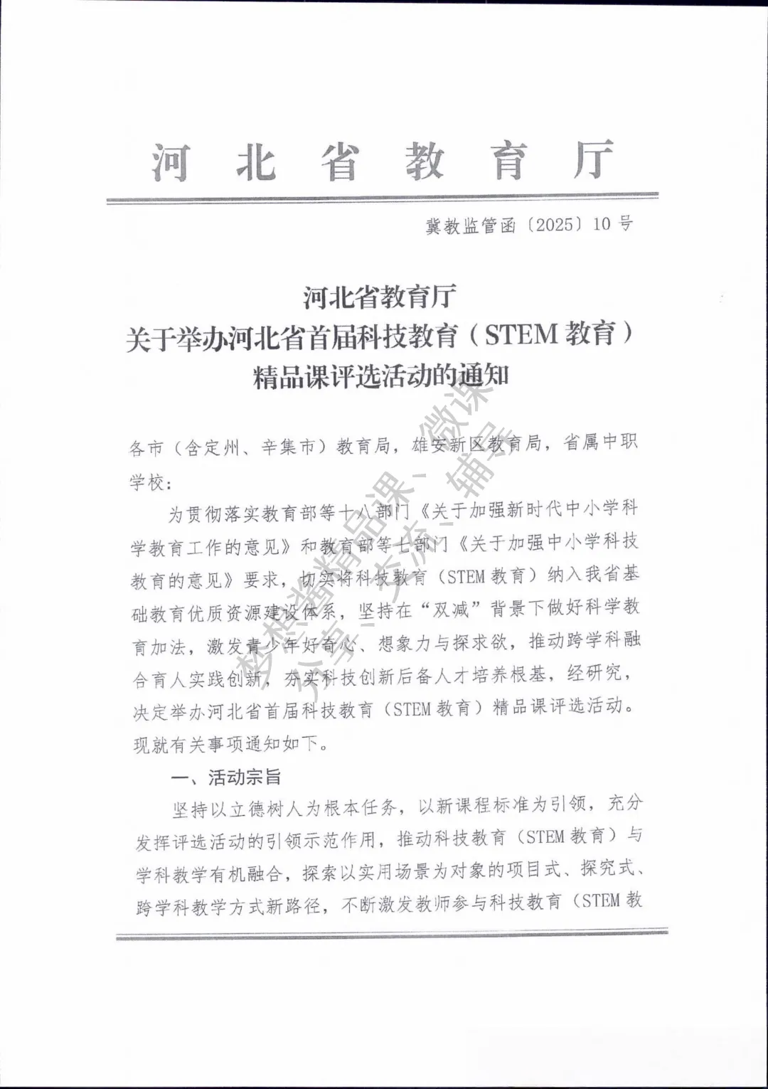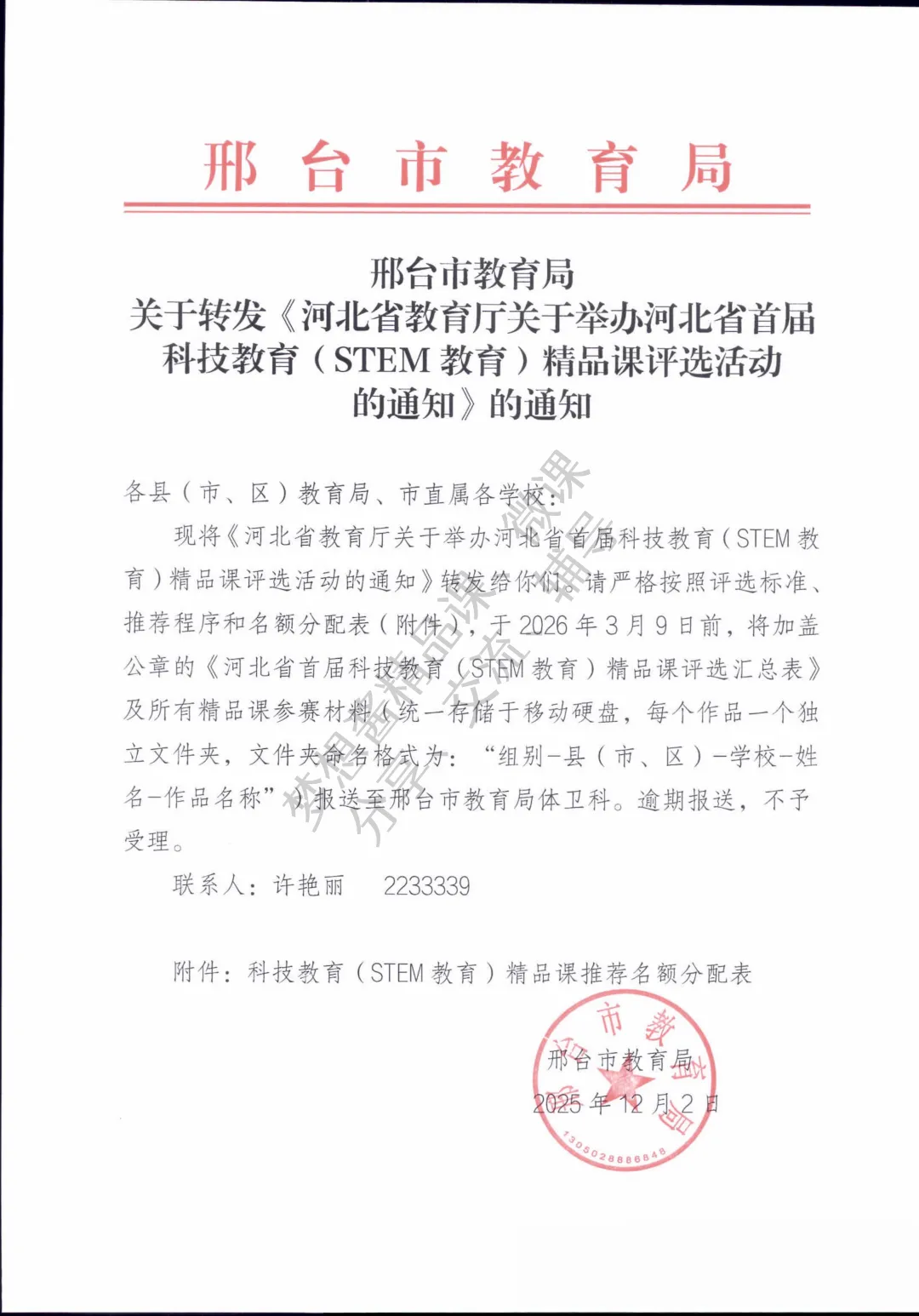 >邢台市教育局关于转发<<河北省教育厅关于举办河北省首届科技教育(STEMI教育)精品课评选活动的通知>>的通知