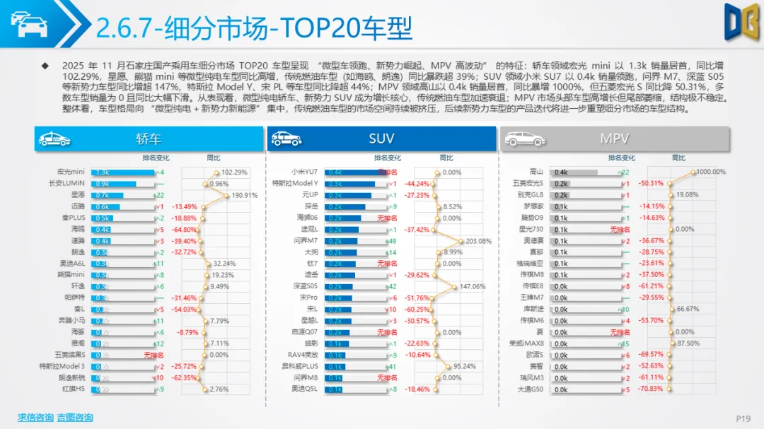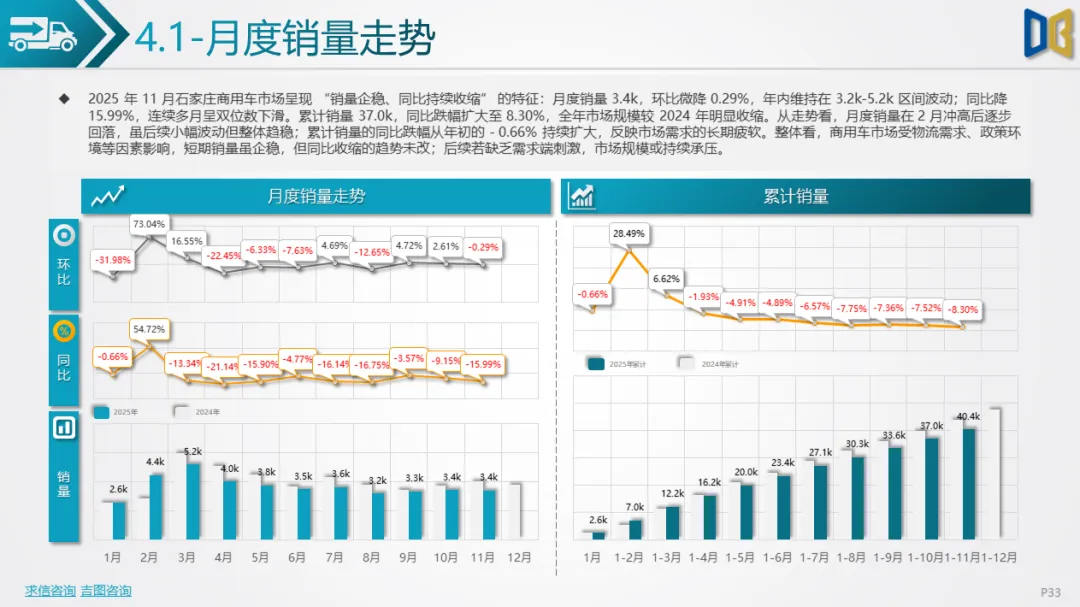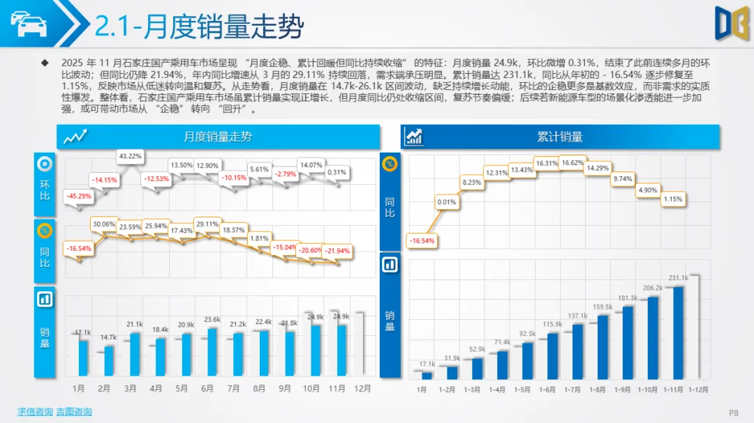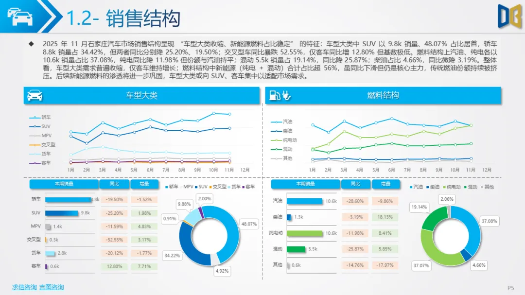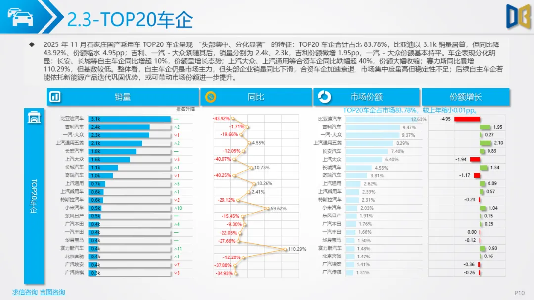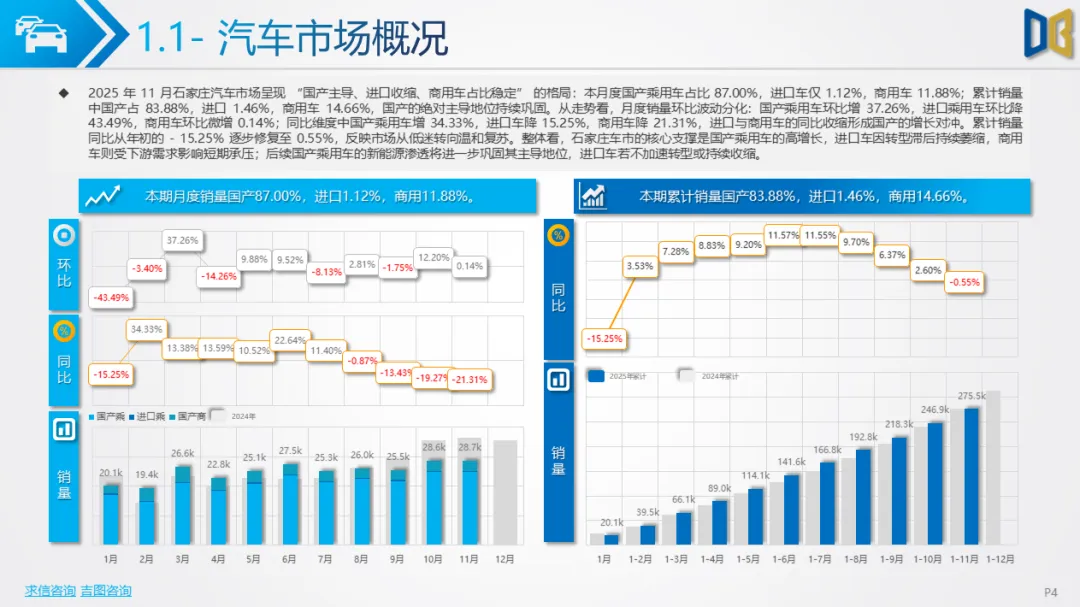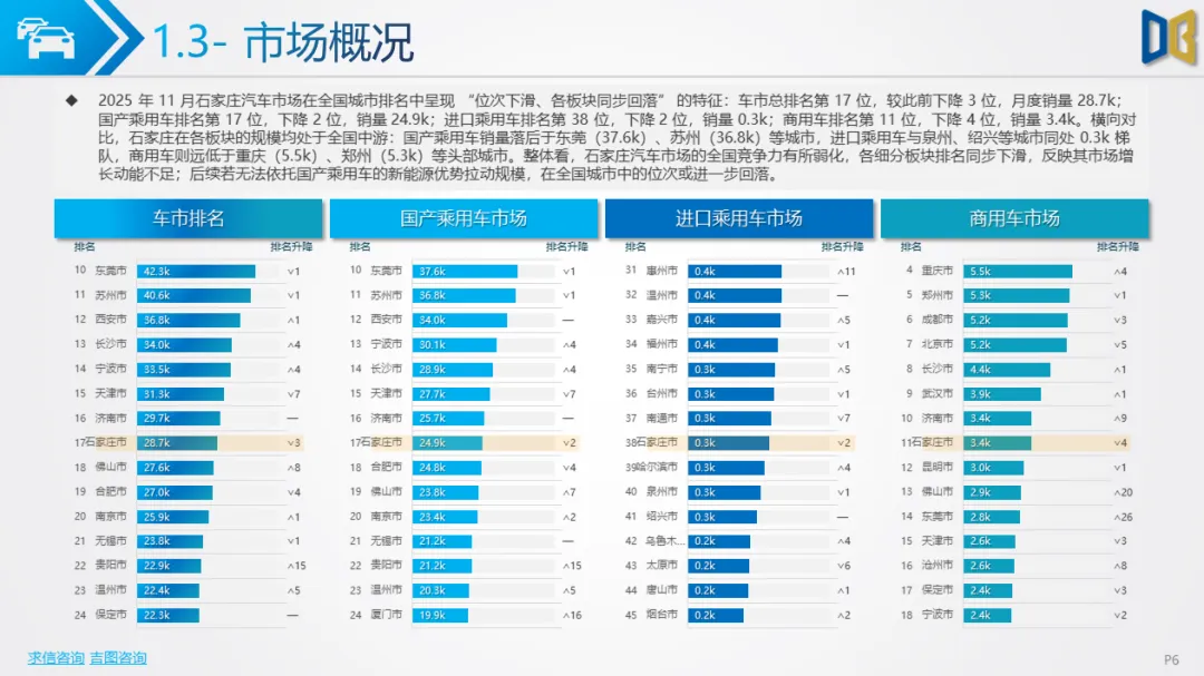 (二)未来趋势展望国产乘用车优势将进一步巩固。商用车市场将持续向低碳化、规模化转型。纯电与混合动力车型的渗透速度将加快,微型货车与新能源重卡的场景化应用将进一步拓展,头部企业凭借技术与品牌优势,市场集中度将持续提升,契合全国商用车行业 “价值竞争” 的新周期。整体来看,2025 年 11 月石家庄汽车市场已形成 “自主新能源主导、进口持续萎缩、商用车结构优化” 的成熟格局,政策引导与需求升级将持续推动市场向低碳化、智能化、场景化方向发展,企业的产品迭代与战略布局将成为决定市场份额的关键因素。