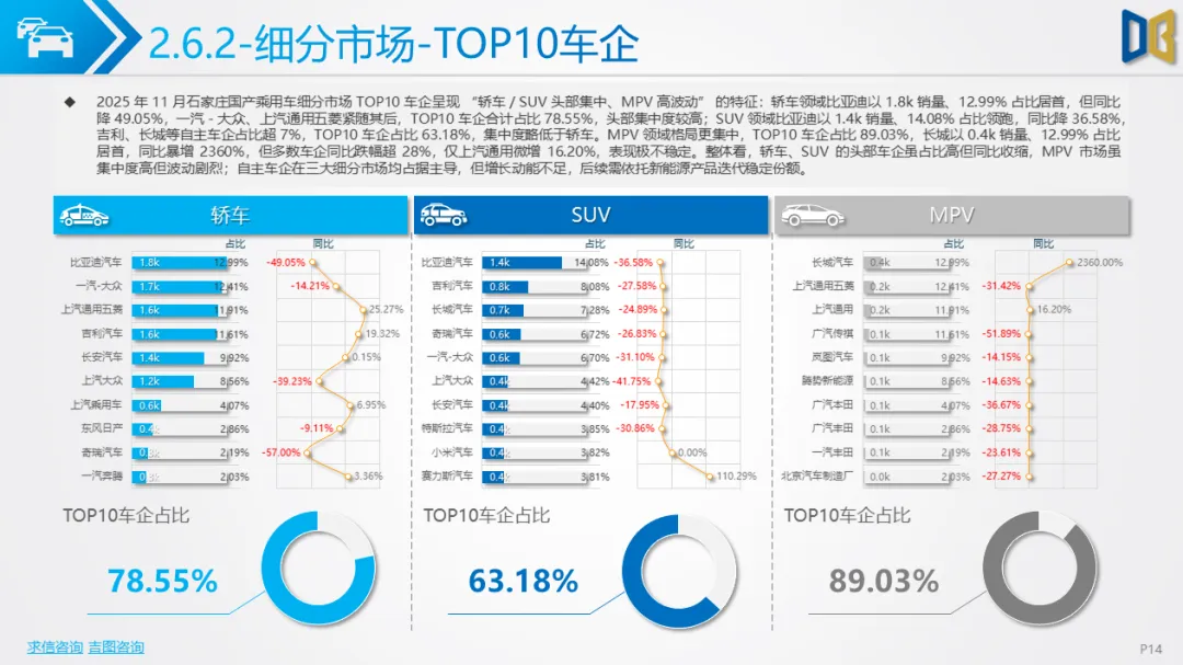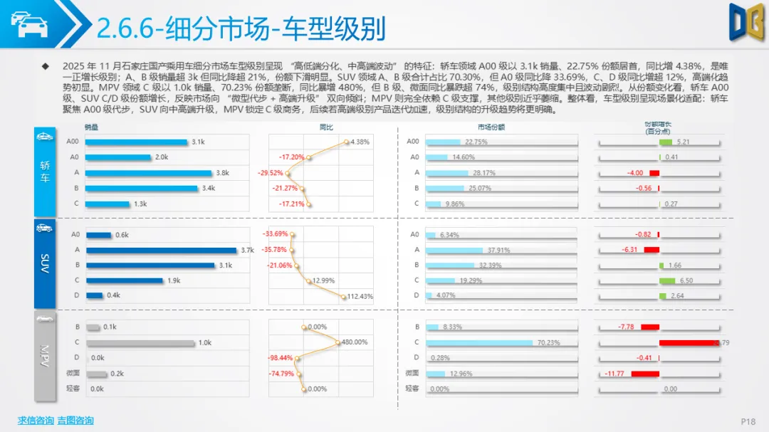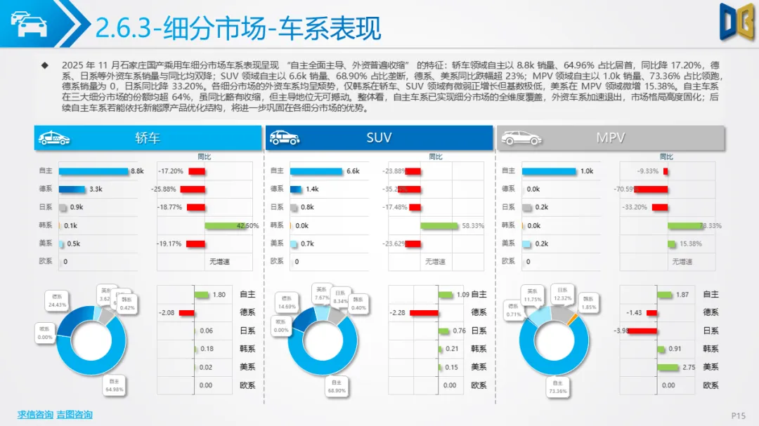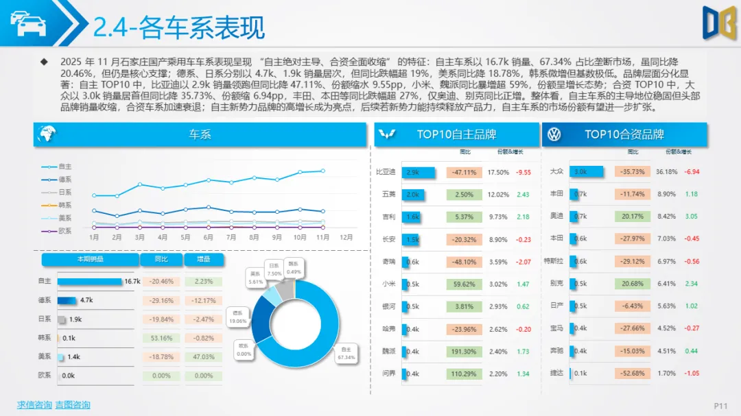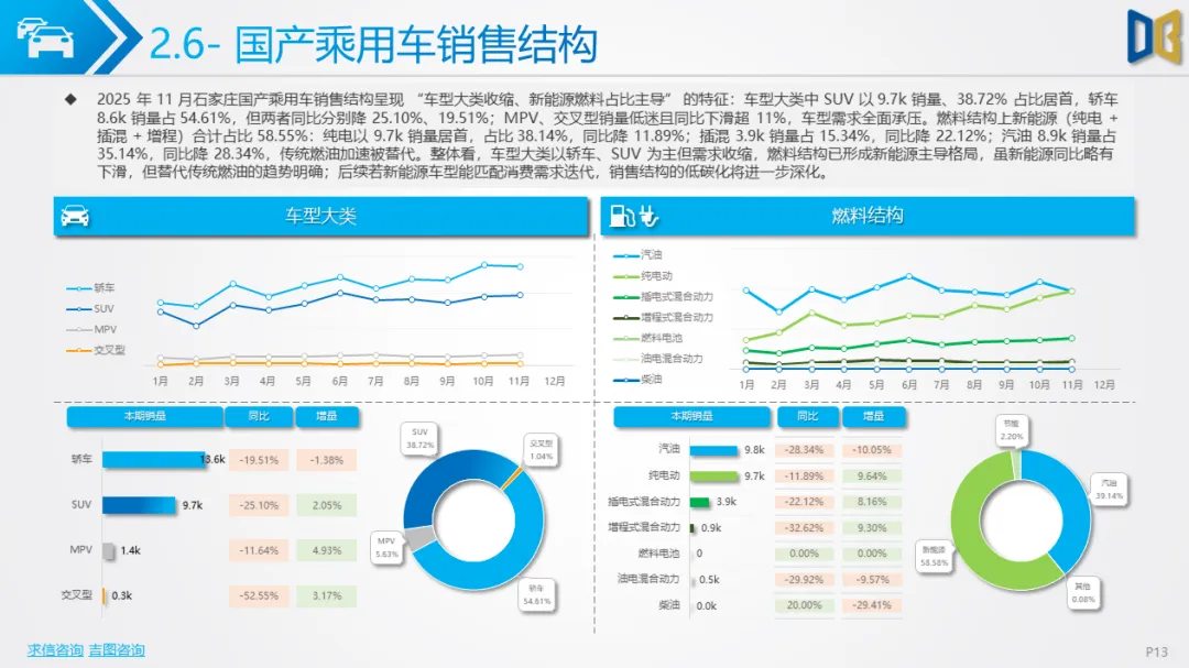 (一)国产乘用车:全维度领跑,细分市场格局固化2025 年 11 月,石家庄国产乘用车市场延续 “自主主导、新能源核心” 的发展态势,三大细分市场均展现出明确的结构性特征。轿车领域,自主车系以 8.8k 销量、64.96% 的绝对占比稳居首位,虽同比小幅下降 17.20%,但仍大幅领先德系、日系等外资车系;燃料结构中新能源占比达 60.12%,纯电车型以 6.7k 销量成为主流,而汽油车型销量同比下滑 23.24%,传统燃油替代进程加速。SUV 领域自主车系垄断优势更为显著,6.6k 销量支撑起 68.90% 的市场份额,德系、美系等外资车系同比跌幅超 23%;新能源占比 57.63%,纯电车型虽同比略有收缩,但仍是消费主力,汽油车型 30.29% 的同比跌幅进一步印证了低碳化趋势。MPV 领域则呈现 “自主领跑 + 插混爆发” 的特点,自主车系以 1.0k 销量、73.36% 占比领跑,插电混动车型同比暴增 95.91%,成为拉动细分市场增长的核心动力,而汽油车型同比下滑 40.39%,逐步退出主流市场。车型级别与动力结构的分化同样明显。