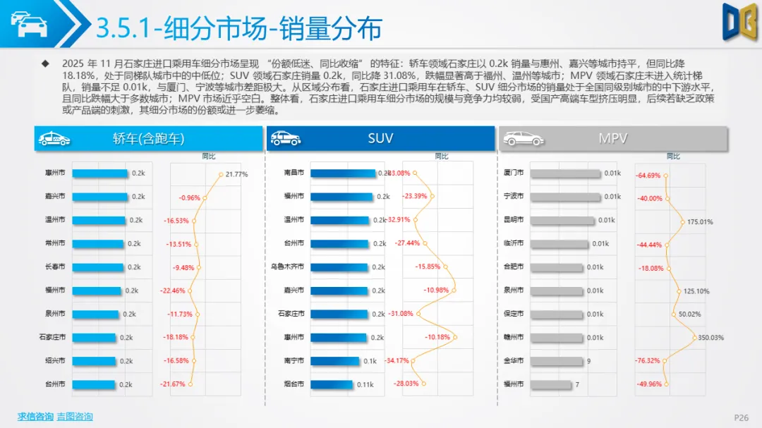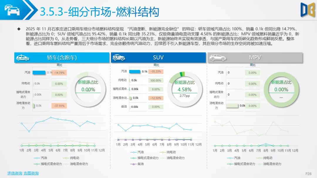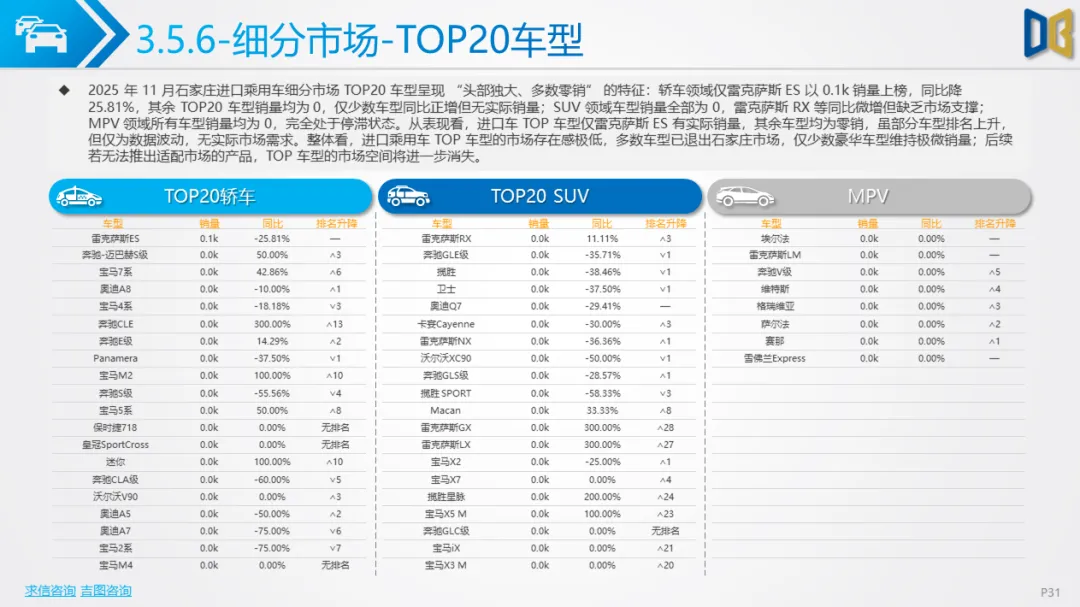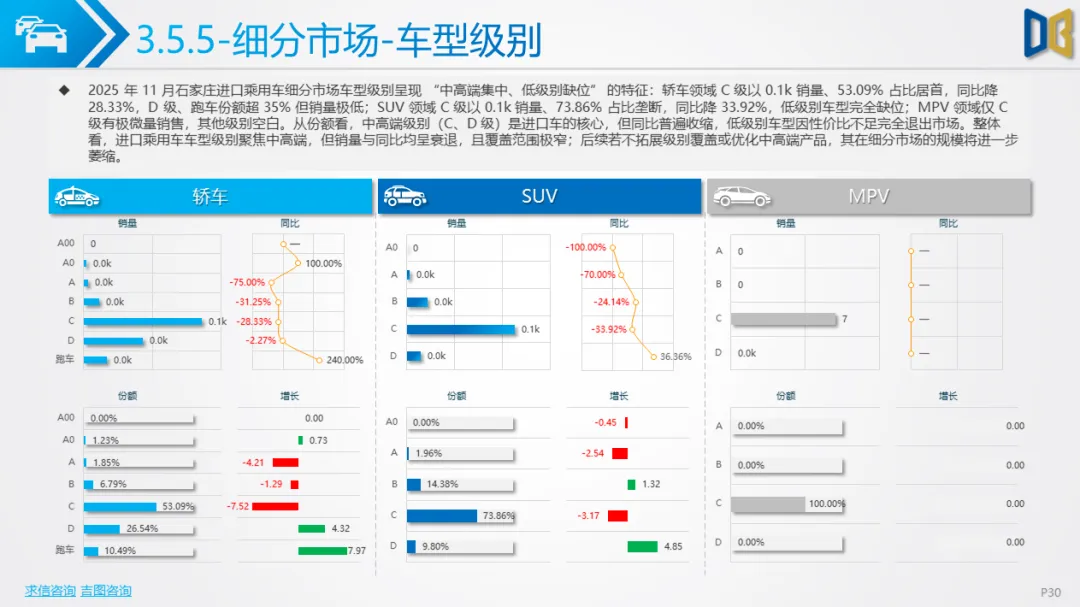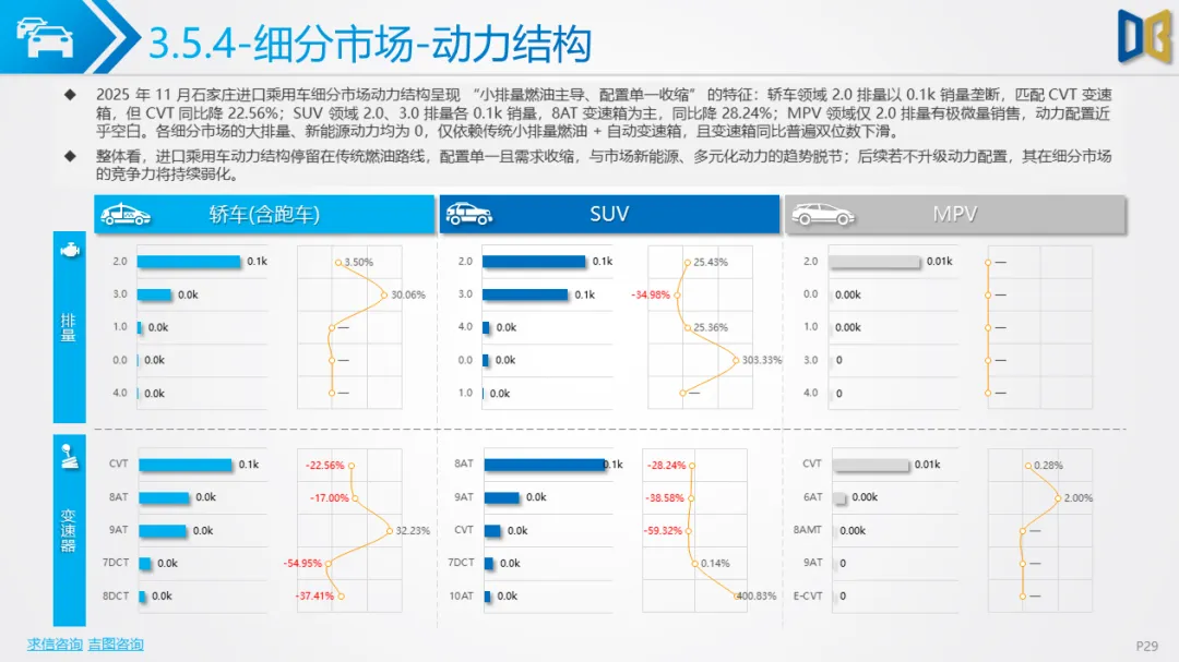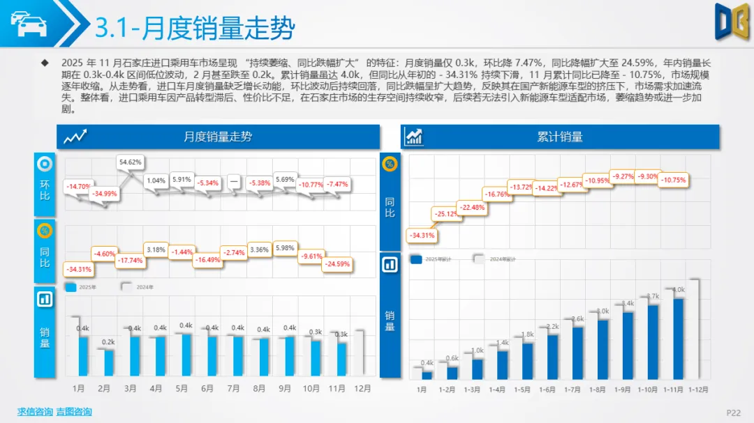 (二)进口乘用车:全面收缩,与市场趋势严重脱节与国产乘用车的强势表现形成鲜明对比,2025 年 11 月石家庄进口乘用车市场呈现 “总量低迷、结构滞后、竞争力弱化” 的全面衰退态势。销量规模持续萎缩,月度销量仅 0.3k,环比降 7.47%,同比跌幅扩大至 24.59%,年内长期在 0.3k-0.4k 区间低位波动,累计销量 4.0k,同比跌幅从年初的 - 34.31% 进一步收窄至 - 10.75%,但整体市场规模逐年收缩的趋势未改。细分结构上的矛盾更为突出。
