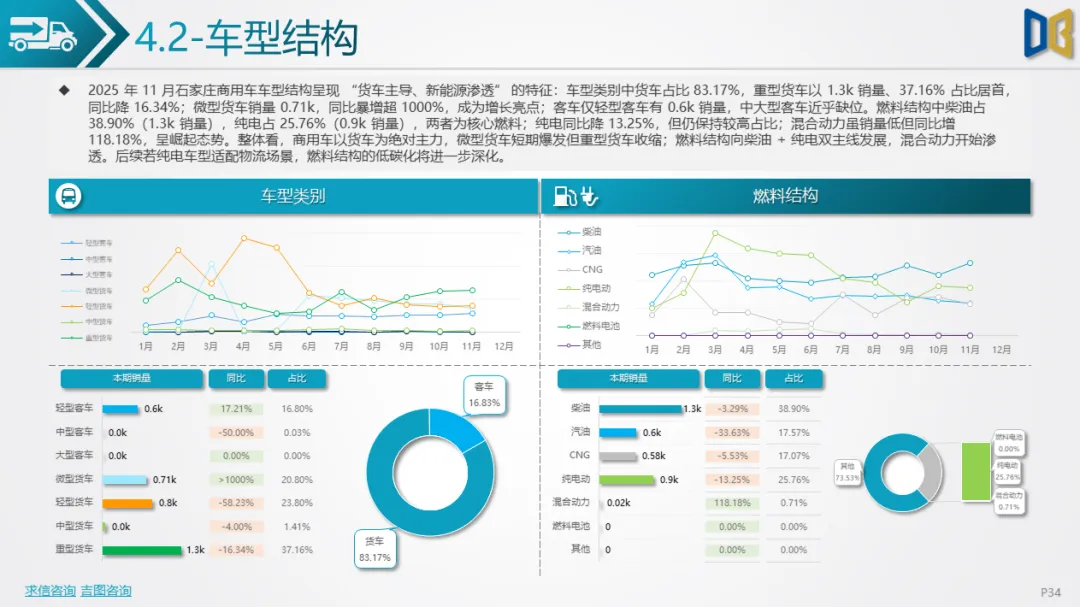 销量企稳,结构优化与分化并存2025 年 11 月,石家庄商用车市场在行业复苏大背景下呈现 “销量趋稳、结构升级、头部集中” 的特征,与全国商用车市场温和增长的态势基本一致。月度销量达 3.4k,环比微降 0.29%,年内维持在 3.2k-5.2k 区间波动,虽同比仍降 15.99%,但累计销量 37.0k,整体市场规模趋于稳定。车型与燃料结构优化成效显著。车型类别中货车以 83.17% 占比成为绝对主力,重型货车以 1.3k 销量、37.16% 占比居首,微型货车同比暴增超 1000%,成为细分市场的最大亮点,而客车市场仅轻型客车有 0.6k 销量,中大型客车近乎缺位。